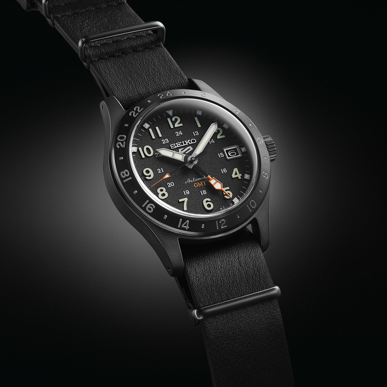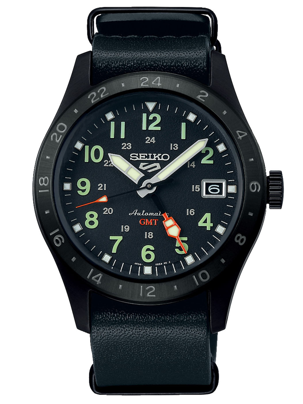 Seiko 5 Sports Field 'Deception' Mechanical GMT Automatic Black Leather Strap SSK025K1