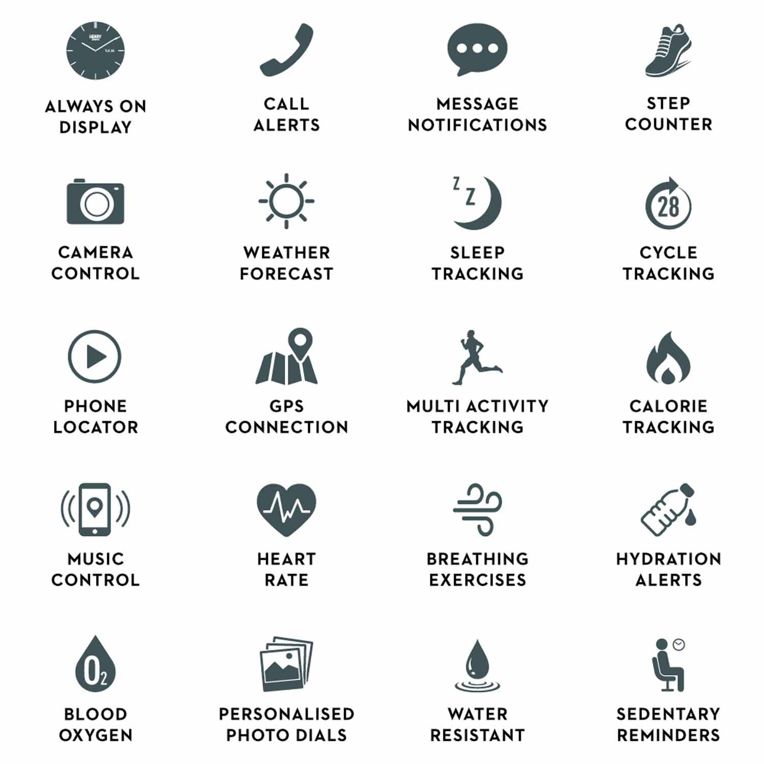 Bluetooth 5.0 , WhatsApp , Ασκήσεις αναπνοής , Δυνατότητα Μόνιμα Ενεργής Οθόνης , Ειδοποιήσεις social media , Ειδοποιήσεις για τον καιρό , Ειδοποίηση κλήσεων , Έλεγχος μουσικής , Ενημέρωση ενυδάτωσης , Έξυπνες ειδοποιήσεις και εμφάνιση μηνυμάτων SMS , και άλλα , Καταγραφή αθλητικής δραστηριότητας , Λειτουργία εύρεσης ρολογιού , Λειτουργία εύρεσης τηλεφώνου , Μέτρηση απόστασης , Μέτρηση θερμίδων , Μετρητής βημάτων , Παρακολούθηση ύπνου , Προσφέρει λειτουργία υπενθύμισης έμμηνου κύκλου για τις κυρίες , Σύνδεση GPS , Χειρισμός κάμερας από απόσταση