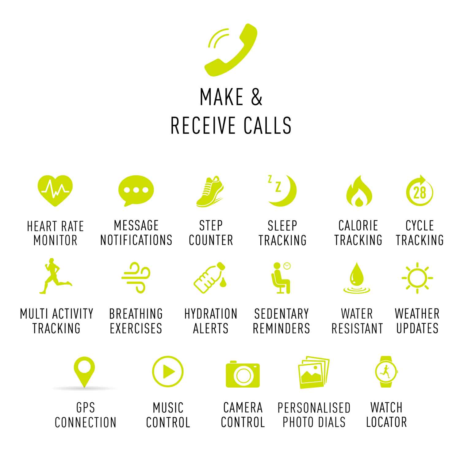 Bluetooth 5.0, WhatsApp, Απάντηση κλήσεων, Ασκήσεις αναπνοής, Ειδοποιήσεις social media, Ειδοποιήσεις για τον καιρό, Ειδοποίηση κλήσεων, Έλεγχος μουσικής, Ενημέρωση ενυδάτωσης, Έξυπνες ειδοποιήσεις και εμφάνιση μηνυμάτων SMS, και άλλα, Καταγραφή αθλητικής δραστηριότητας, Λειτουργία εύρεσης ρολογιού, Λειτουργία εύρεσης τηλεφώνου, Μέτρηση απόστασης, Μέτρηση θερμίδων, Μετρητής βημάτων, Παρακολούθηση ύπνου, Προσφέρει λειτουργία υπενθύμισης έμμηνου κύκλου για τις κυρίες, Σύνδεση GPS, Χειρισμός κάμερας από απόσταση