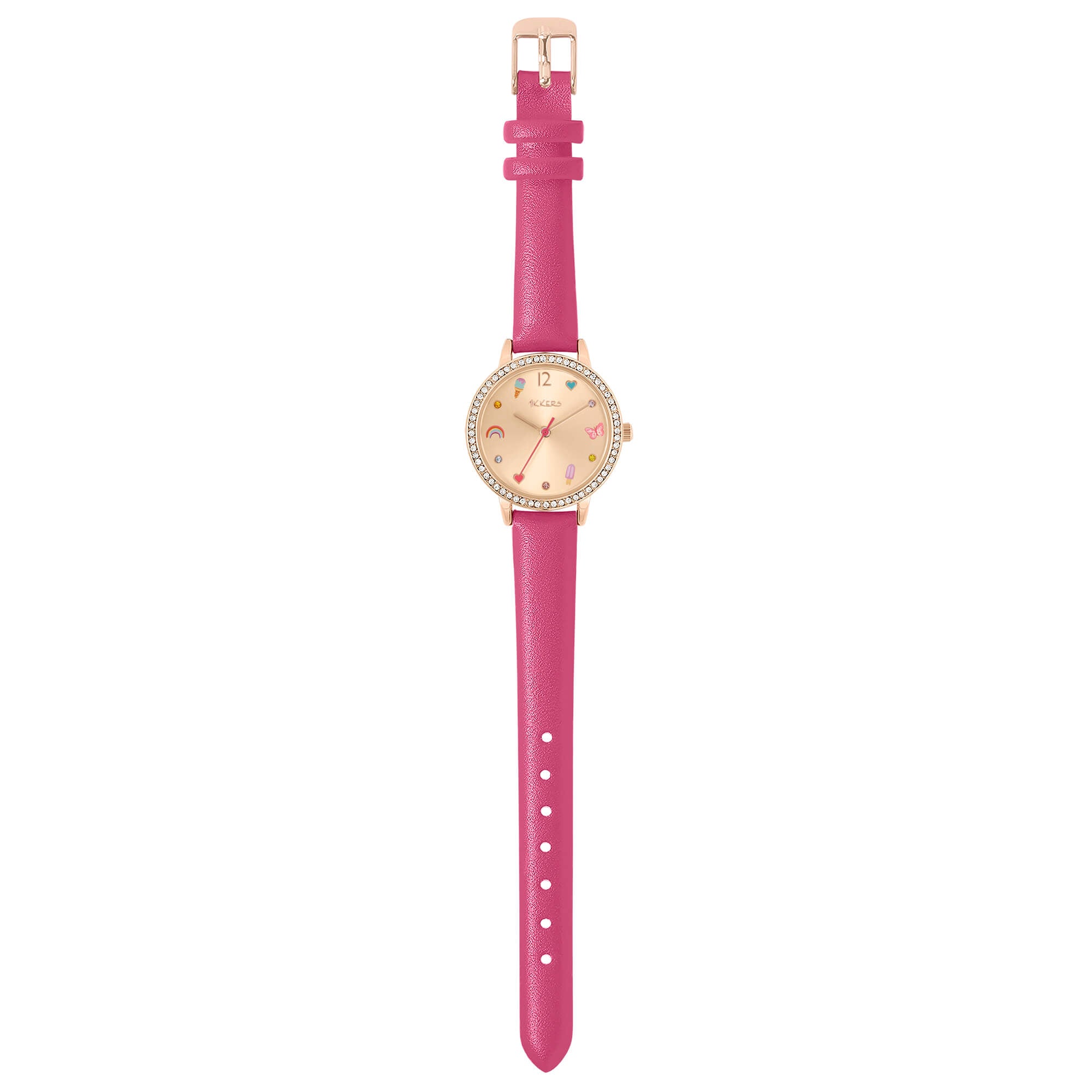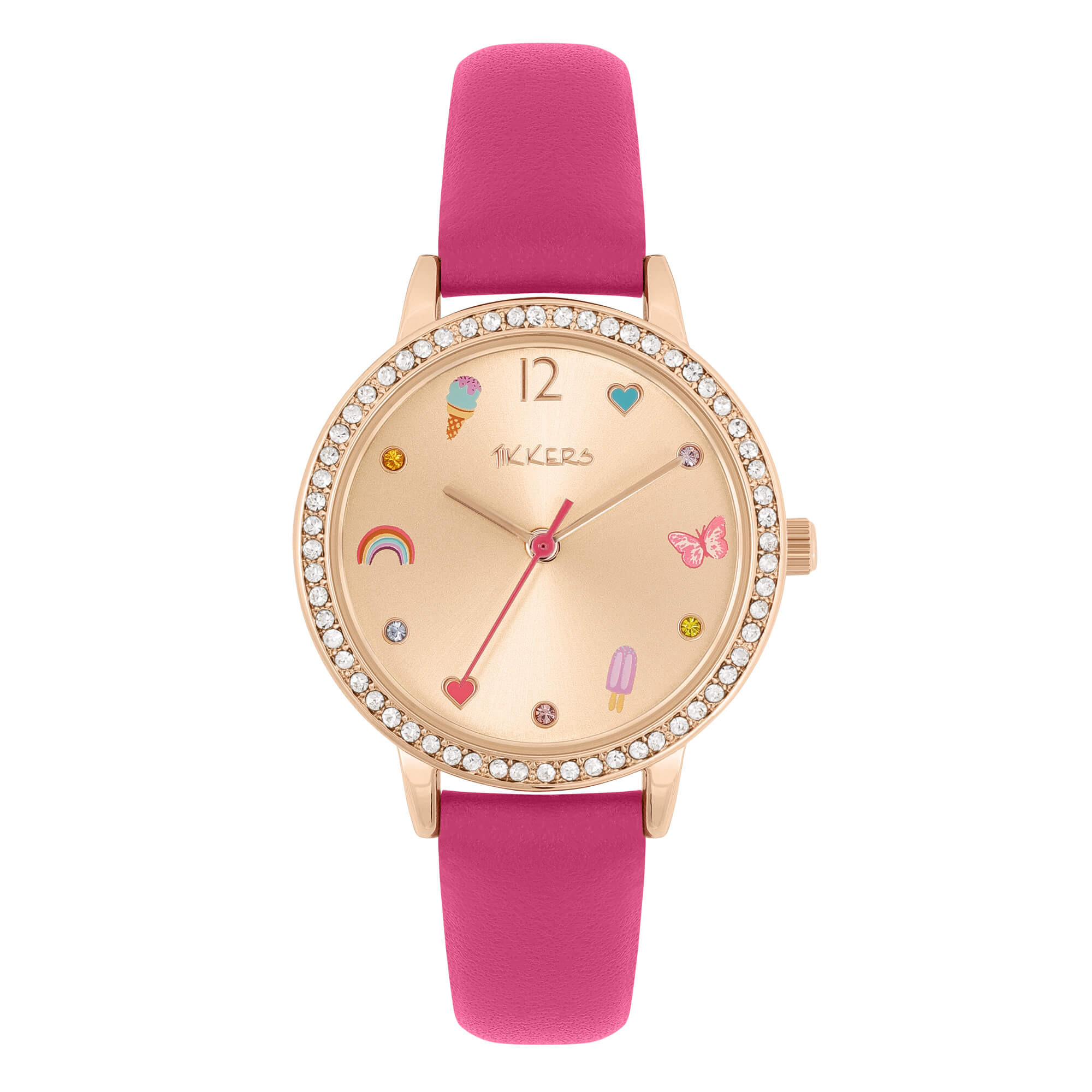 Ρολόι Tikkers Pink Multi Icon! Αυτό το όμορφο ρολόι έχει στο καντράν παραστάσεις από πολύχρωμα παγωτά, πεταλούδες και καρδιές. Συνοδεύεται από ένα πολύχρωμο βραχιόλι σε επίσημη συσκευασία της Tikkers.