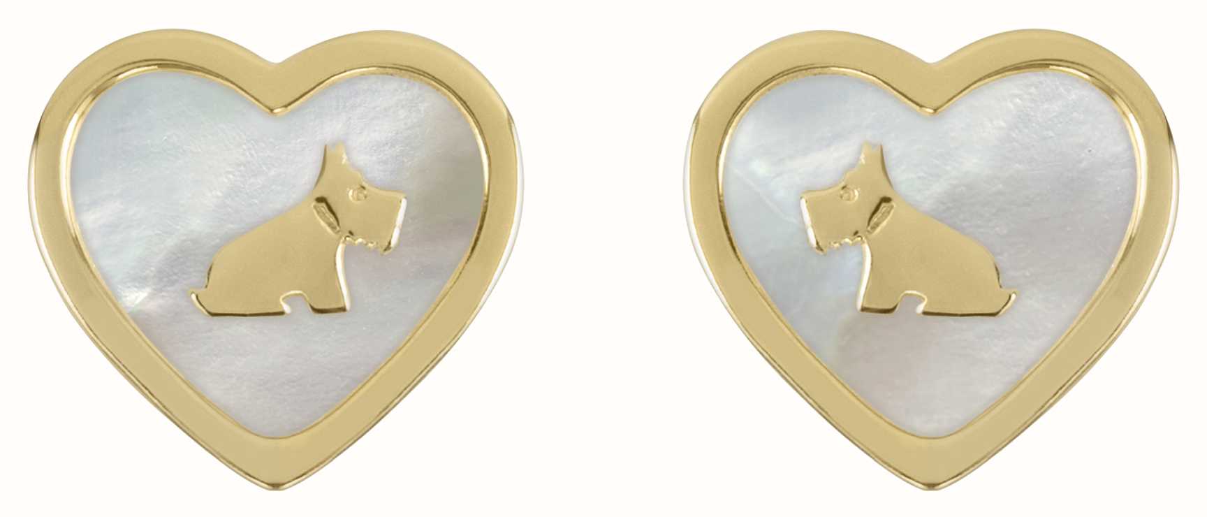 Γυναικεία σκουλαρίκια της εταιρείας Radley London σε σχήμα καρδιάς με λευκό ιριδίζον σμάλτο και φιγούρα σκύλου. Κατασκευασμένα απο επιχρυσωμένο ασήμι.