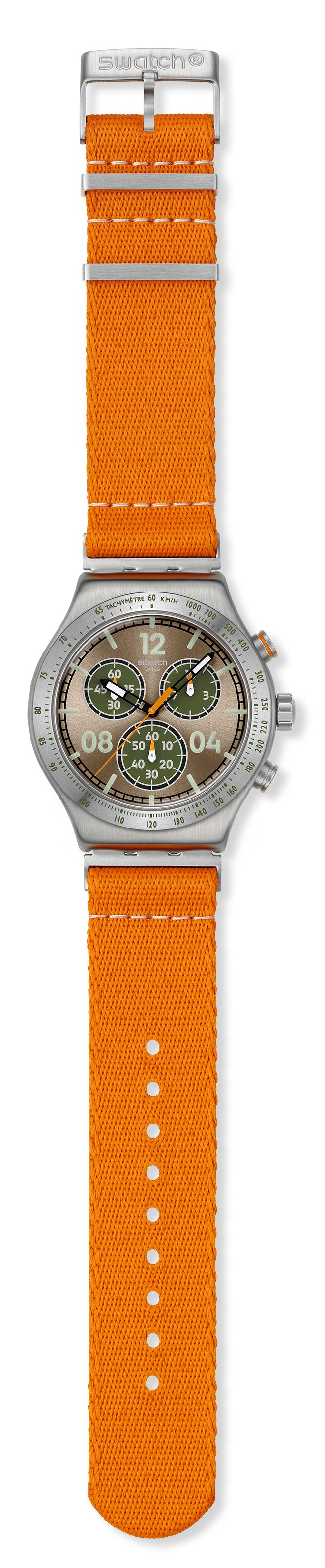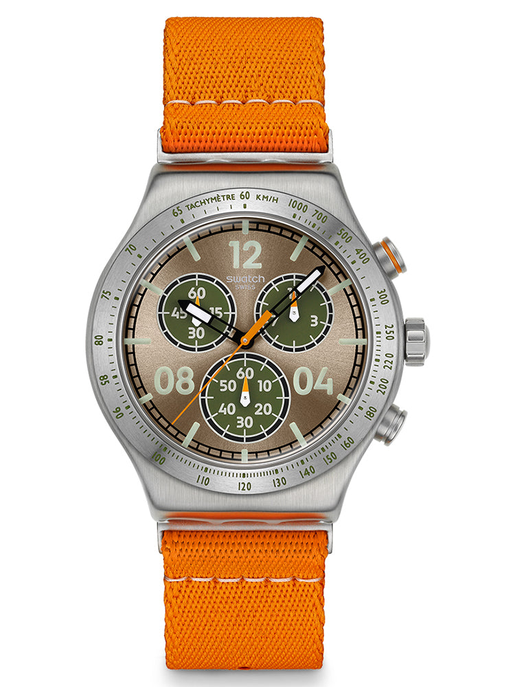 Αυτός ο σπορτίφ χρονογράφος διαθέτει καντράν σε ανοιχτό καφέ με sun-brushed φινίρισμα και τυπωμένες ενδείξεις και αριθμούς σε ανοιχτό πράσινο που λάμπουν στο σκοτάδι. Την ώρα δείχνουν ο μαύρος ωροδείκτης και λεπτοδείκτης που λάμπουν στο σκοτάδι και ο πορτοκαλί δείκτης δευτερολέπτων χρονογράφου. Η κάσα από βουρτσισμένο ανοξείδωτο ατσάλι συμπληρώνεται από την ταιριαστή στεφάνη με χαραγμένη ταχυμετρική κλίμακα σε ανοιχτό πράσινο. Το ρολόι ολοκληρώνουν το πορτοκαλί υφασμάτινο λουράκι με θηλάκια και μισό κούμπωμα από βουρτσισμένο ανοξείδωτο ατσάλι.