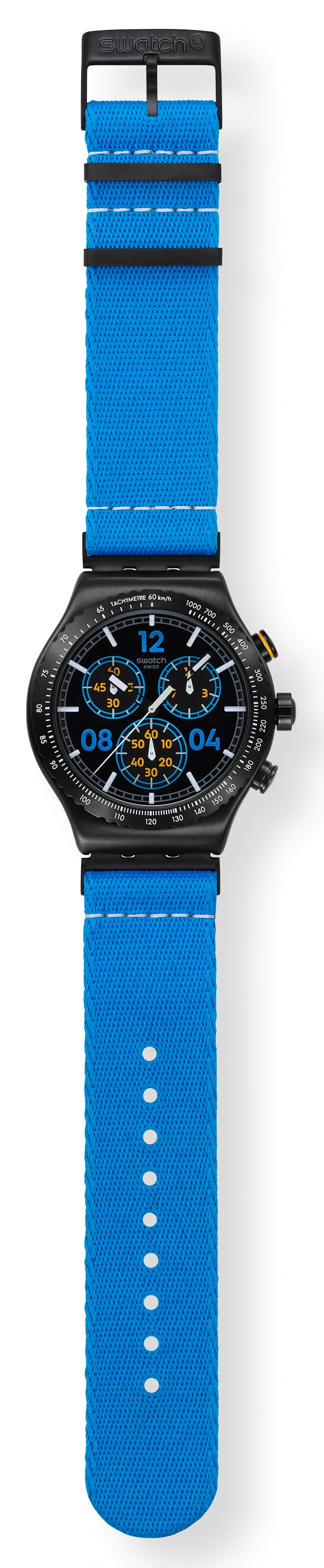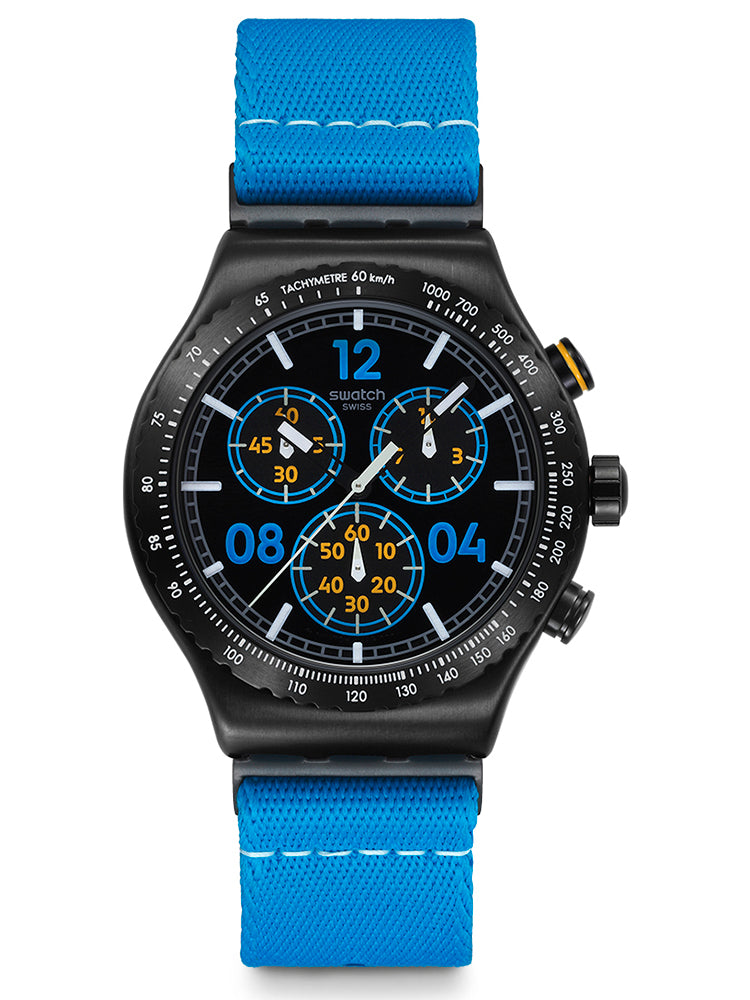 Αυτός ο σπορτίφ χρονογράφος διαθέτει μαύρο καντράν με sun-brushed φινίρισμα, λευκές τυπωμένες ενδείξεις που λάμπουν στο σκοτάδι και μπλε και κίτρινους τυπωμένους αριθμούς. Την ώρα δείχνουν ο μαύρος ωροδείκτης και λεπτοδείκτης που λάμπουν στο σκοτάδι και ο λευκός δείκτης δευτερολέπτων χρονογράφου. Η κάσα από βουρτσισμένο ανοξείδωτο ατσάλι με μαύρο PVD συμπληρώνεται από την ταιριαστή στεφάνη με λευκή χαραγμένη ταχυμετρική κλίμακα. Το ρολόι ολοκληρώνουν το μπλε υφασμάτινο λουράκι με θηλάκια και μισό κούμπωμα από βουρτσισμένο ανοξείδωτο ατσάλι, και τα δυο με μαύρο PVD.