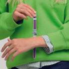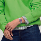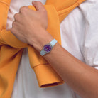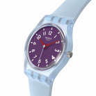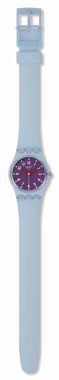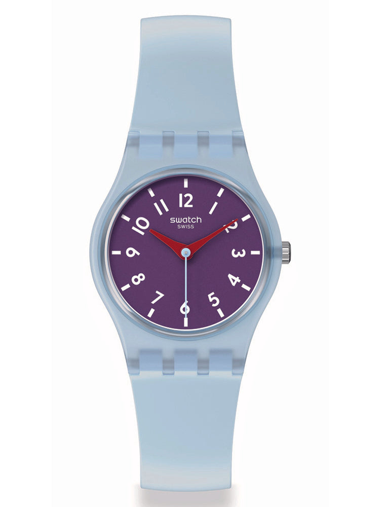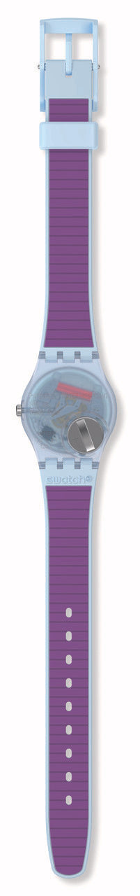 Αυτό το παιχνιδιάρικο ρολόι διαθέτει μενεξεδί καντράν με λευκoύς εκτυπωμένους αριθμούς και ενδείξεις και κόκκινους ωροδείκτες και λεπτοδείκτες σε διαφανή γαλάζια κάσα. Διαθέτει λουράκι που είναι γαλάζιο στην μπροστινή πλευρά και μενεξεδί με ανάγλυφη υφή στην πίσω πλευρά.