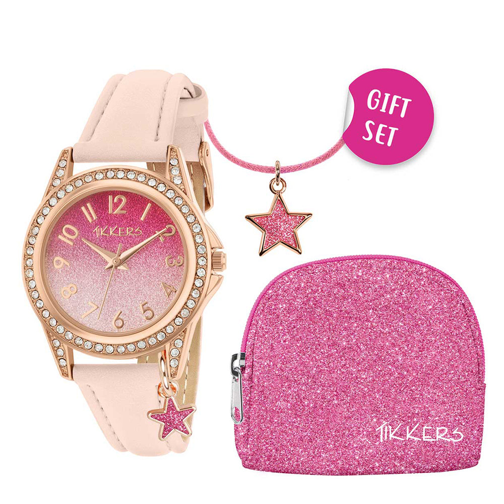 Σας παρουσιάζουμε το σούπερ αστραφτερό γκλίτερ ρολόι μας! Το ρολόι αυτό σε τόνους ροζ χρυσού διαθέτει μια εντυπωσιακή στεφάνη. Το καντράν έχει ένα ροζ ombre glitter εφέ που συμπληρώνεται από ροζ χρυσούς δείκτες και αριθμούς. Το ρολόι έχει ένα απαλό ροζ λουράκι από δερματίνη και αγκράφα σε ροζ χρυσό. Το σετ περιλαμβάνει επίσης ένα ροζ γκλίτερ τσαντάκι και κολιέ με αστέρι, όλα σε μια όμορφη συσκευασία δώρου Tikkers. Όλα τα ρολόγια έχουν εγγύηση ενός έτους.