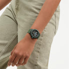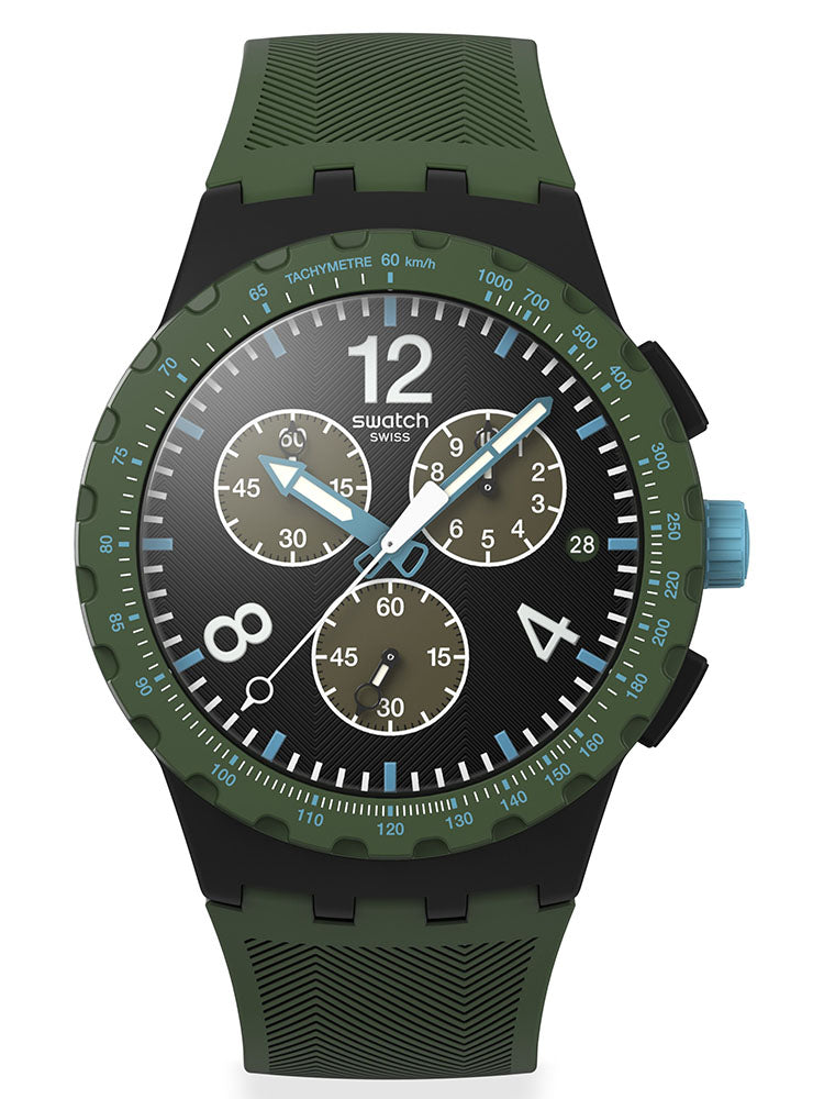 Αυτός ο χρονογράφος έχει ανάγλυφο μαύρο καντράν με τυπωμένους άσπρους αριθμούς και τυπωμένη ζώνη ενδείξεων λεπτών σε ανοιχτό μπλε και άσπρο, σκούρα πράσινα υποκαντράν με μαύρους δείκτες που λάμπουν στο σκοτάδι και παράθυρο ημερομηνίας στη θέση της ώρας 3. Ο ωροδείκτης και λεπτοδείκτης σε ανοιχτό μπλε με εφέ που λάμπει στο σκοτάδι καθώς και ο άσπρος δείκτης δευτερολέπτων χρονογράφου, δείχνουν την ώρα. Η ματ μαύρη κάσα συμπληρώνεται από μία ματ σκούρα πράσινη στεφάνη με τυπωμένη ταχυμετρική κλίμακα σε ανοιχτό μπλε και άσπρο. Ένα ανάγλυφο, ματ σκούρο πράσινο λουράκι με ματ μαύρο θηλάκι και κούμπωμα, ολοκληρώνει το ρολόι.