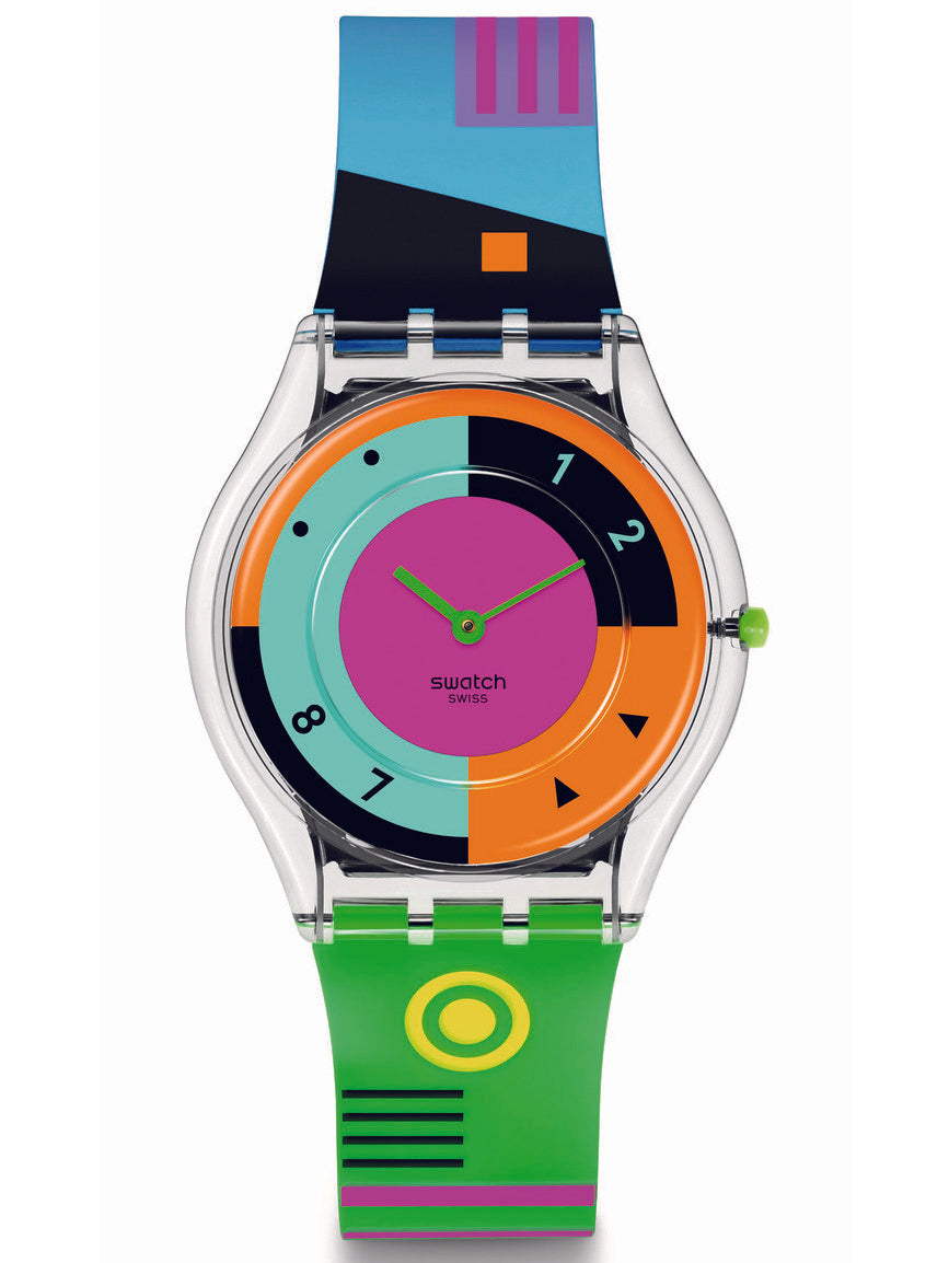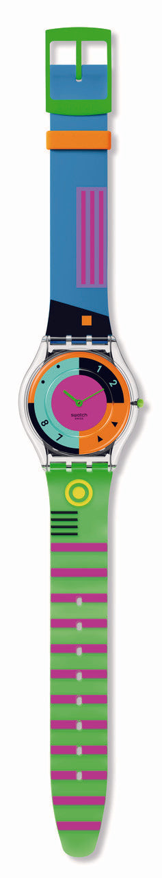 Αυτό το εξαιρετικά λεπτό ρετρό ρολόι εμπνέεται από ένα συλλεκτικό κομμάτι Swatch της δεκαετίας του ‘80: το HOT RACER (LK115). Το καντράν με τα πολλά και ζωηρά χρώματα περιλαμβάνει πράσινο ωροδείκτη και λεπτοδείκτη σε διαφανή γυαλιστερή κάσα βιολογικής προέλευσης με τζάμι βιολογικής προέλευσης. Το διαφανές πράσινο ματ κάτω λουράκι και το μπλε επάνω λουράκι διαθέτουν πολύχρωμη εκτύπωση και συμπληρώνονται από το πορτοκαλί θηλάκι και το πράσινο κούμπωμα.