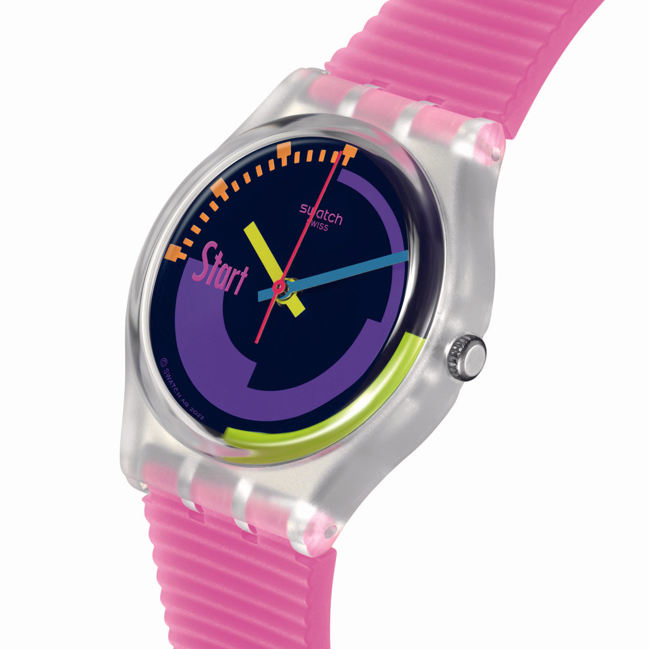 Αυτό το ρετρό ρολόι εμπνέεται από ένα θρύλο της Swatch από τη δεκαετία του ‘90: το PINK PODIUM (LK119). Το πολύχρωμο καντράν του ρολογιού διαθέτει κίτρινο ωροδείκτη, μπλε λεπτοδείκτη και ροζ δείκτη δευτερολέπτων σε διαφανή ματ κάσα βιολογικής προέλευσης με τζάμι βιολογικής προέλευσης. Το διαφανές ροζ ματ ανάγλυφο λουράκι συμπληρώνουν τα μπλε και διαφανή ματ θηλάκια και το διαφανές μπλε ματ κούμπωμα.