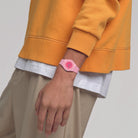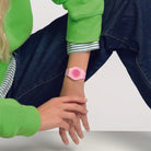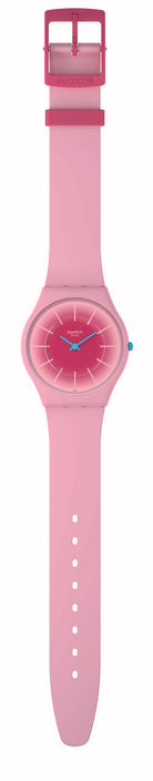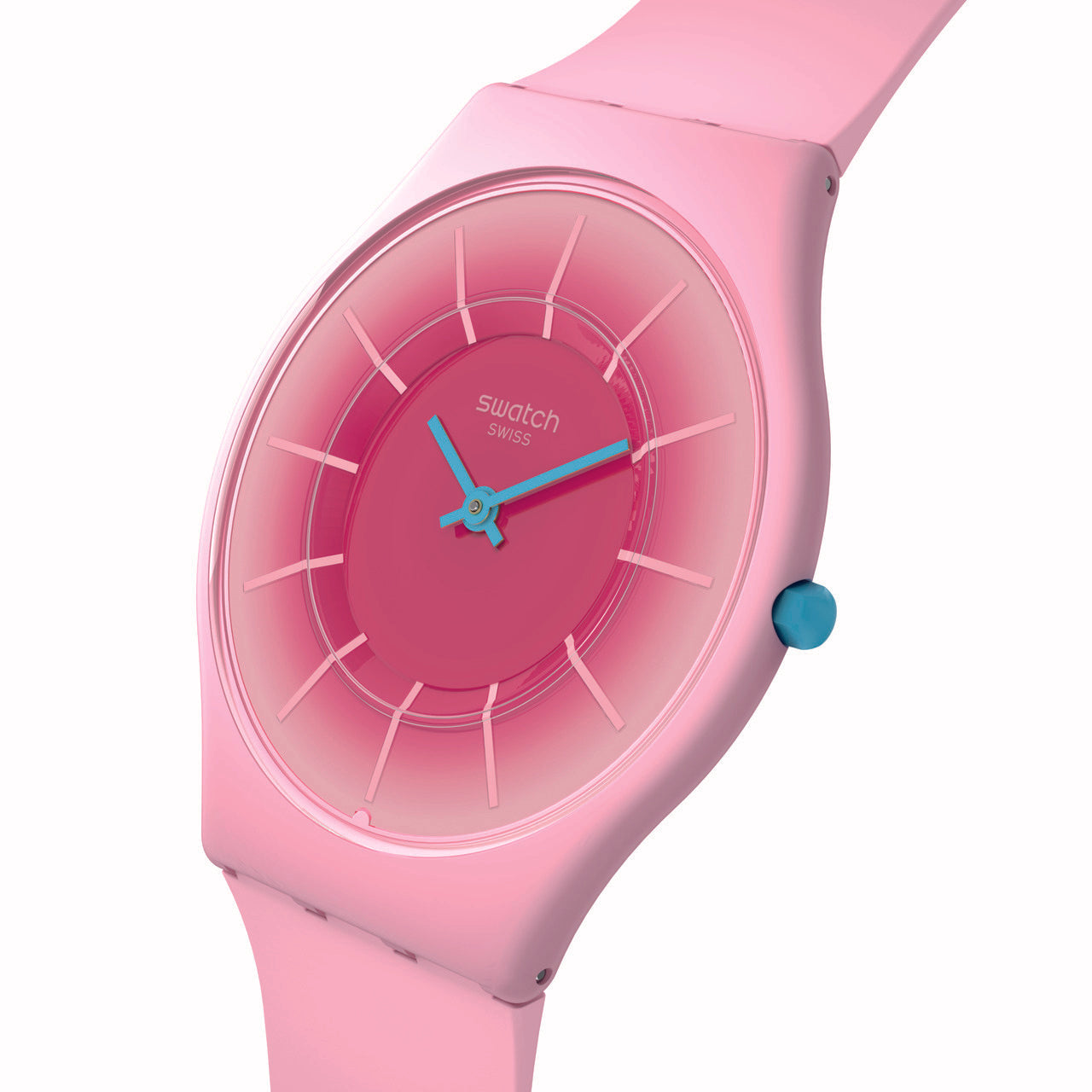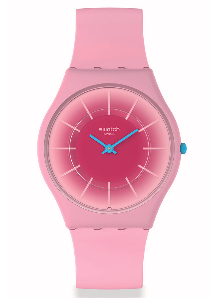 Αυτό το εξαιρετικά λεπτό ρολόι ακτινοβολεί ροζ, από το ντεγκραντέ εκτυπωμένο καντράν του με τις λευκές ενδείξεις σε κάσα και τζάμι βιολογικής προέλευσης μέχρι το λουράκι του με το ταιριαστό θηλάκι και κούμπωμα. Οι τιρκουάζ δείκτες και η κορώνα προσθέτουν ένα διασκεδαστικό στοιχείο αντίθεσης σε αυτό το ροζ ρολόι.