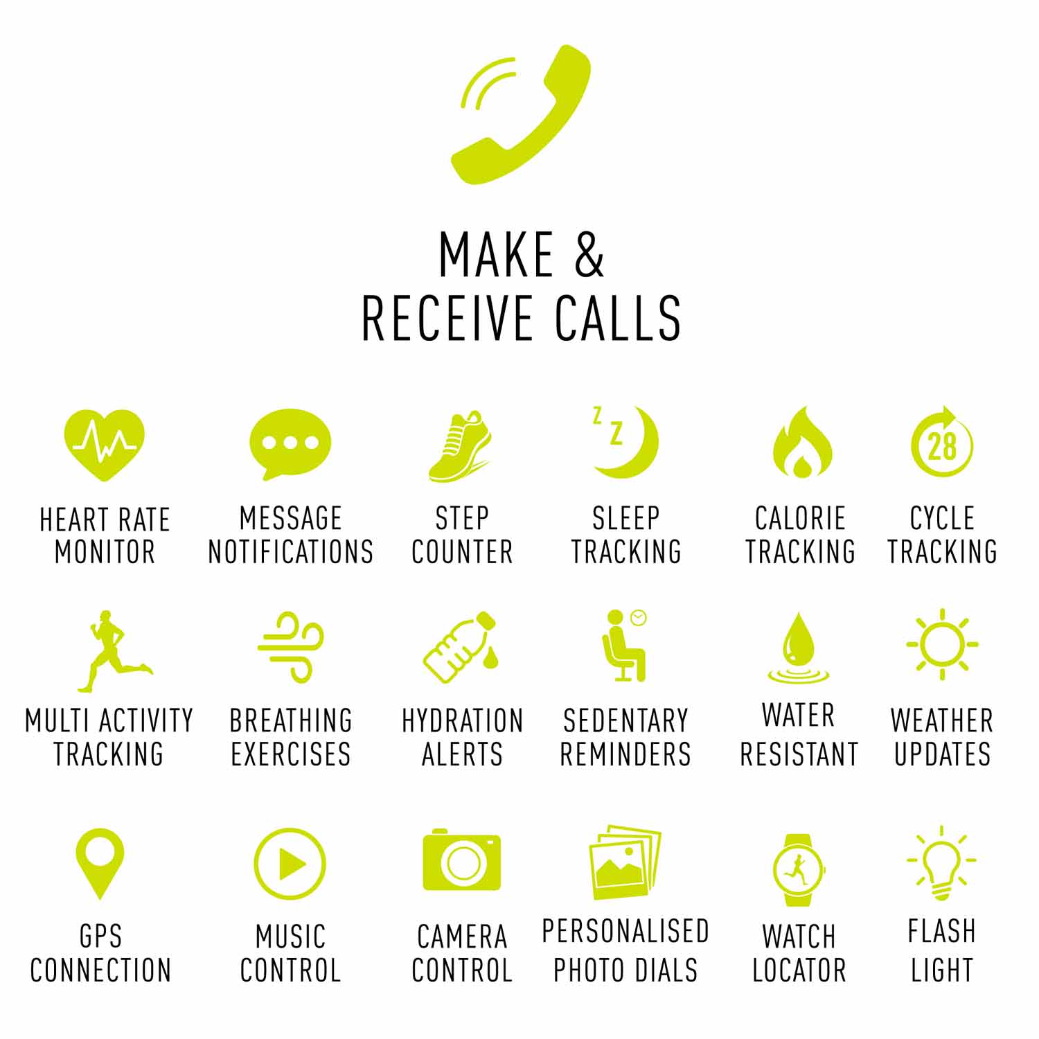 Bluetooth 5.0, WhatsApp, Ασκήσεις αναπνοής, Ειδοποιήσεις social media, Ειδοποιήσεις για τον καιρό, Ειδοποίηση κλήσεων, Έλεγχος μουσικής, Ενημέρωση ενυδάτωσης, Έξυπνες ειδοποιήσεις και εμφάνιση μηνυμάτων SMS, και άλλα, Καταγραφή αθλητικής δραστηριότητας, Λειτουργία εύρεσης ρολογιού, Λειτουργία εύρεσης τηλεφώνου, Μέτρηση απόστασης, Μέτρηση θερμίδων, Μετρητής βημάτων, Παρακολούθηση ύπνου, Προσφέρει λειτουργία υπενθύμισης έμμηνου κύκλου για τις κυρίες, Σύνδεση GPS, Χειρισμός κάμερας από απόσταση