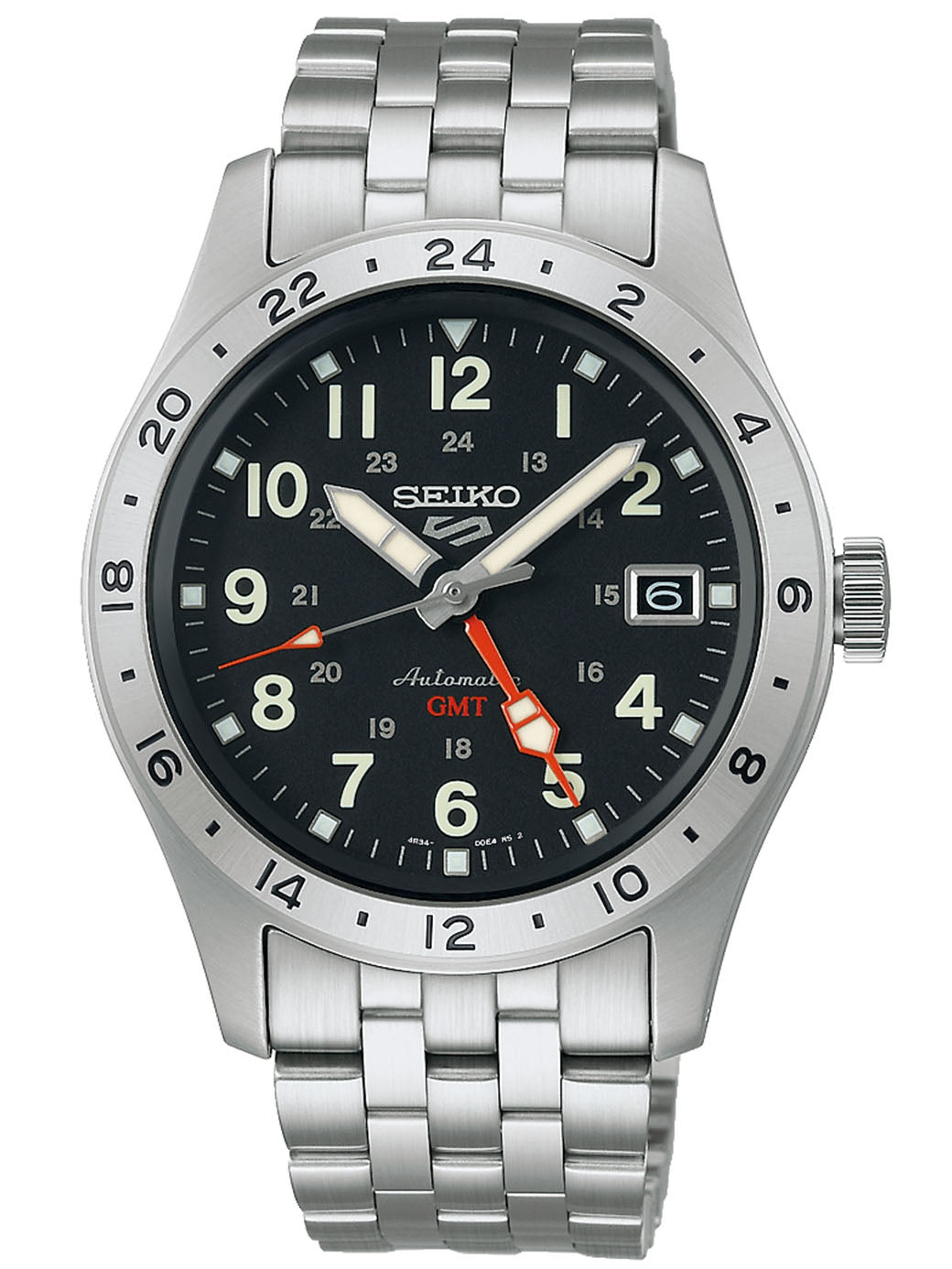 Η συλλογή Seiko 5 Sports Field δημιουργήθηκε με στρατιωτικό σχέδιο – αντλώντας έμπνευση από ένα στυλ που αρχικά ονομαζόταν «trench watch», που δημιουργήθηκε για να είναι στιβαρό και αξιόπιστο σε δύσκολες συνθήκες – απηχώντας τα χαρακτηριστικά του Seiko 5 Sports. Η ασημί στεφάνη, διαθέτει ένδειξη 24 ωρών και μεγάλο, πορτοκαλί δείκτη GMT. Ο βασικός σχεδιασμός και το μέγεθος παραμένουν ίδια με τα πρωτότυπα ρολόγια, διασφαλίζοντας ότι το στυλ σχεδίασης παραμένει διαχρονικό ενώ οι μηχανισμοί εξελίσσονται.