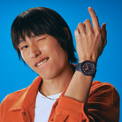 Αυτό το μεγάλου μεγέθους ρολόι ξεχωρίζει χάρη στο σκούρο μπλε καντράν με τους τρισδιάστατους αριθμούς σε σκούρο κόκκινο χρώμα, την πορτοκαλί και λευκή τυπωμένη ζώνη ενδείξεων λεπτών και τη σκούρα μπλε ένδειξη ημέρας/ημερομηνίας με τη λευκή εκτύπωση στη θέση της ώρας 3. Την ώρα δείχνουν ο ωροδείκτης και λεπτοδείκτης σε σκούρο κόκκινο που λάμπουν στο σκοτάδι και ο πορτοκαλί δείκτης δευτερολέπτων. Η σκούρα μπλε ματ κάσα και η ταιριαστή στεφάνη συμπληρώνονται από το ντεγκραντέ, σκούρο μπλε και πορτοκαλί ματ λουράκι, τα σκούρα μπλε ματ θηλάκια και το σκούρο μπλε ματ μισό κούμπωμα.
