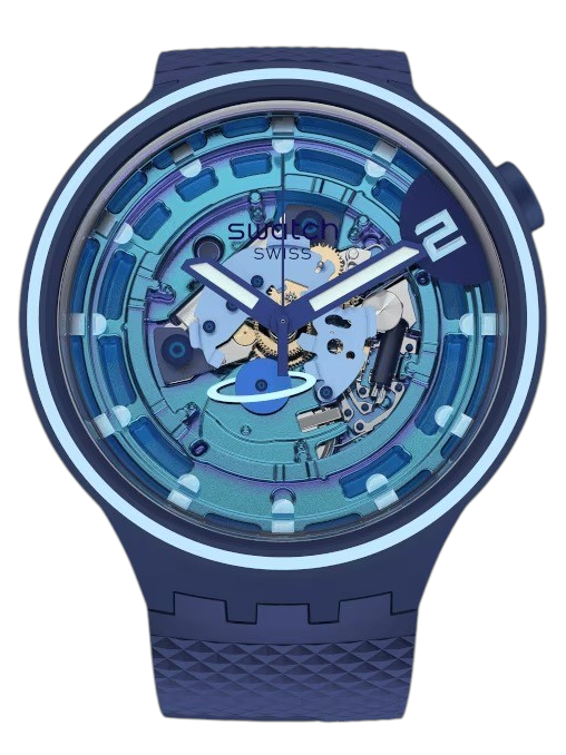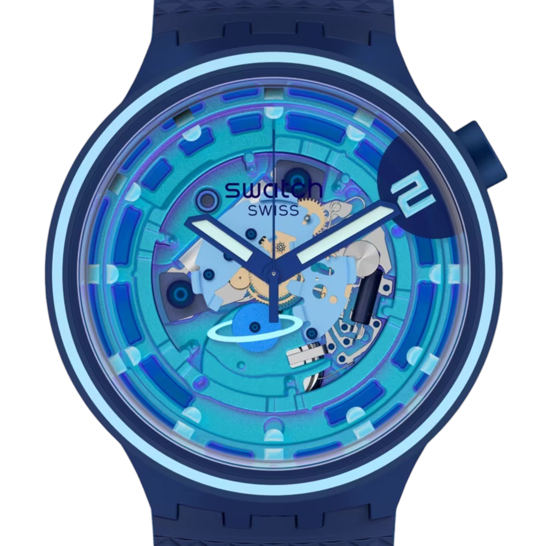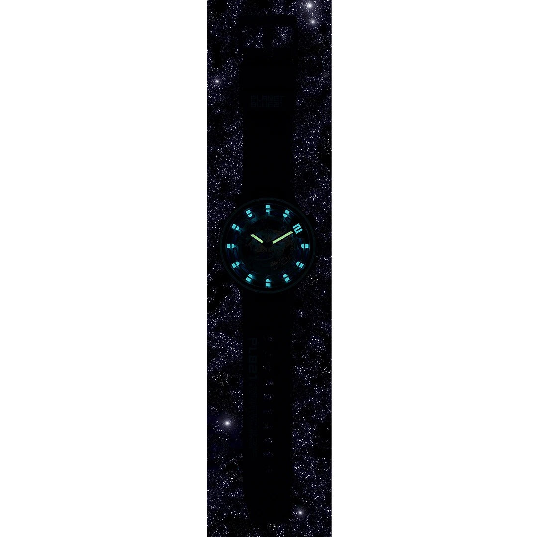 Αυτό το ρολόι διατίθεται με δύο εμπνεόμενα από το διάστημα λουράκια σιλικόνης που σε στιβαρά σχέδια - όλα με σκοπό να αναδείξουν το εκθαμβωτικό εφέ Swatch Solar Spectrum στο καντράν. Το διαφανές καντράν με την πολύχρωμη εκτύπωσή του επιτρέπει στο καντράν και στους δείκτες να λάμψουν με Swatch Glow. Ένας μπλε πλανήτης είναι ειδικά τοποθετημένος στο μηχανισμό αντικαθιστώντας το συμβατικό τροχό