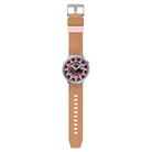 Αυτό το μεγάλου μεγέθους ρολόι ξεχωρίζει χάρη στο σκούρο μωβ ανοιχτό καντράν του με τα σκούρα μωβ στοιχεία του μηχανισμού, τις ενδείξεις της ώρας σε ανοιχτό ροζ, τη μπεζ ζώνη ενδείξεων λεπτών, τον ασημί ωροδείκτη και λεπτοδείκτη που λάμπουν στο σκοτάδι και τον ασημί δείκτη δευτερολέπτων. Η αμμοβολισμένη κάσα από ανοξείδωτο ατσάλι με την ταιριαστή στεφάνη και το κουμπί πίεσης συμπληρώνεται από το μπεζ ματ λουράκι με τα θηλάκια σε μπεζ και ανοιχτό ροζ ματ χρώμα και το αμμοβολισμένο μισό κούμπωμα από ανοξείδωτο ατσάλι.