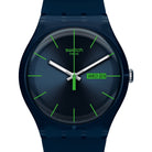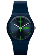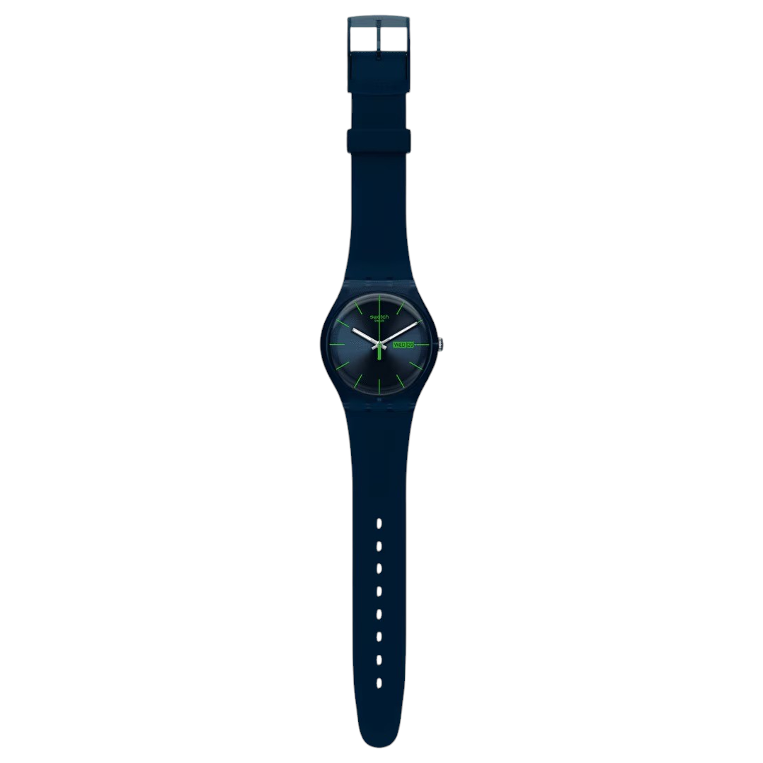 Το sun-brushed σκούρο μπλε καντράν αυτού του ρολογιού περιλαμβάνει πράσινες ενδείξεις ώρας και πράσινη ένδειξη ημέρας-ημερομηνίας με μαύρη εκτύπωση στη θέση της ώρας 3. Την ώρα δείχνουν ο ασημί ωροδείκτης και λεπτοδείκτης που λάμπουν στο σκοτάδι και ο πράσινος δείκτης δευτερολέπτων. Το ρολόι ολοκληρώνουν η διαφανής σκούρα μπλε ματ κάσα, το σκούρο μπλε ματ λουράκι με το ταιριαστό θηλάκι και το διαφανές σκούρο μπλε ματ κούμπωμα.