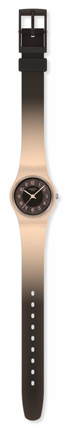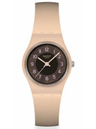 Αυτό το μικρό ρολόι διαθέτει καφέ καντράν με sun-brushed φινίρισμα,σκούρα καφέ τυπωμένη κουκκίδα στο κέντρο και τυπωμένους αριθμούς και ζώνη ενδείξεων λεπτών σε ανοιχτό ροζ. Την ώρα δείχνουν ο μπεζ ωροδείκτης και λεπτοδείκτης που λάμπουν στο σκοτάδι και ο δείκτης δευτερολέπτων σε ανοιχτό ροζ. Η μπεζ ματ κάσα συνδυάζεται με ντεγκραντέ, μπεζ και σκούρο καφέ ματ λουράκι, καθώς και σκούρο καφέ ματ θηλάκι και κούμπωμα.