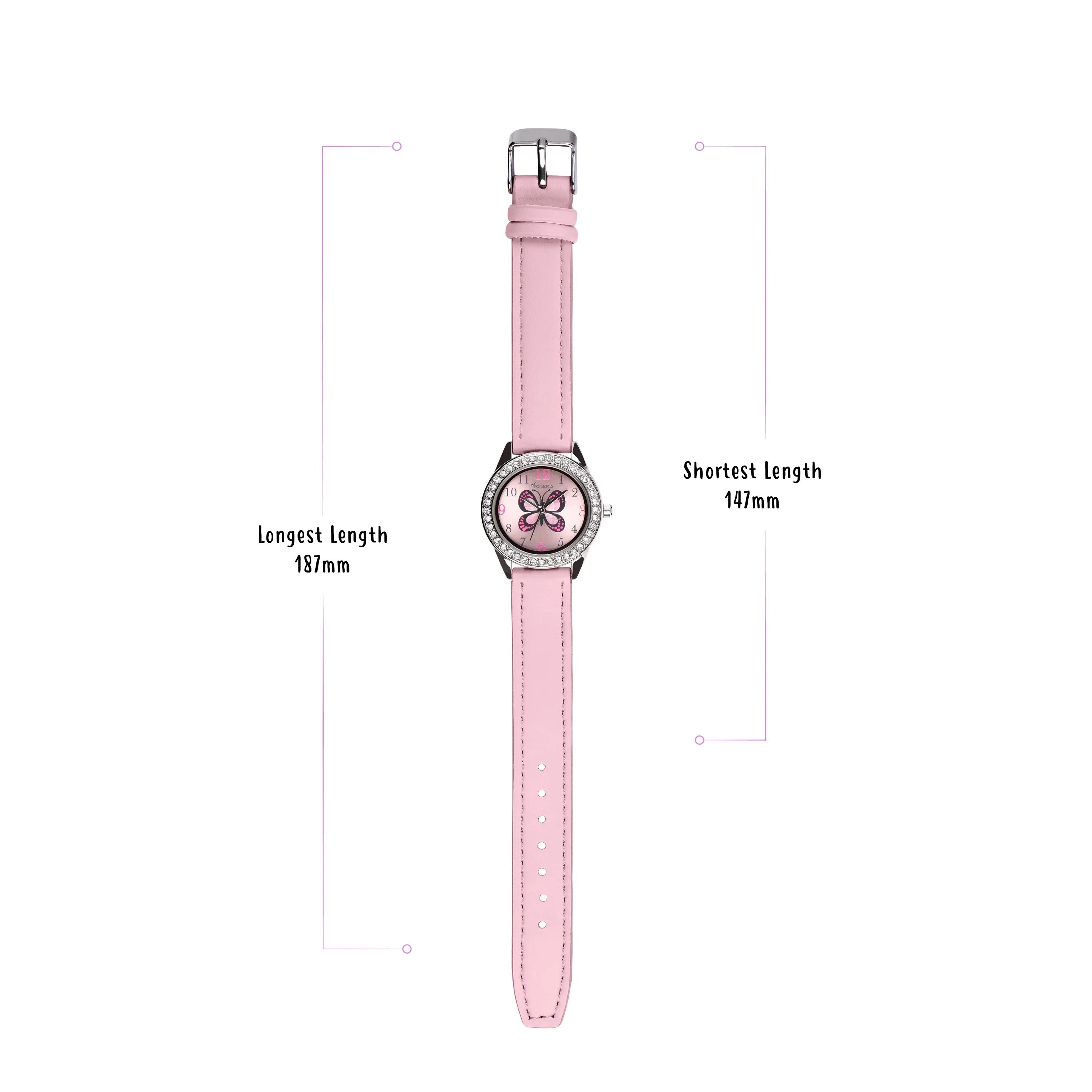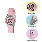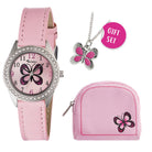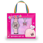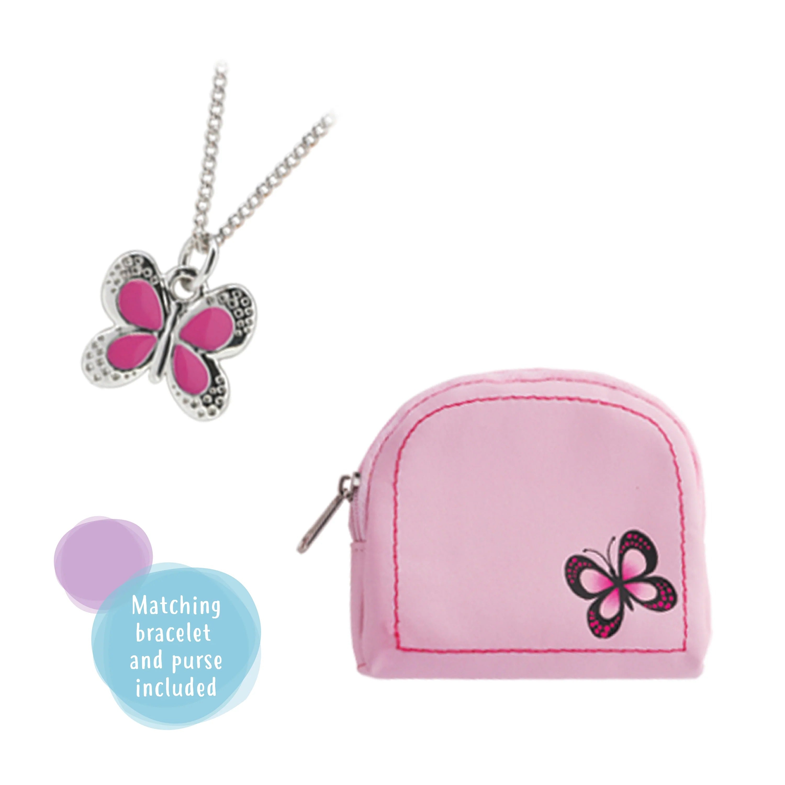 Το σετ περιλαμβάνει ένα ροζ πορτοφόλι και ένα παιδικό κολιέ με πεταλούδα.