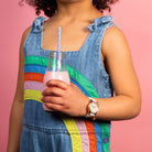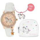 Το σετ δώρου μονόκερος περιέχει ένα αστραφτερό ρολόι σε τόνους ροζ χρυσού. Το καντράν διαθέτει έναν πολύχρωμο μαγικό μονόκερο. Το ρολόι έχει μαλακό λευκό λουράκι από δερματίνη και αγκράφα σε ροζ χρυσό.