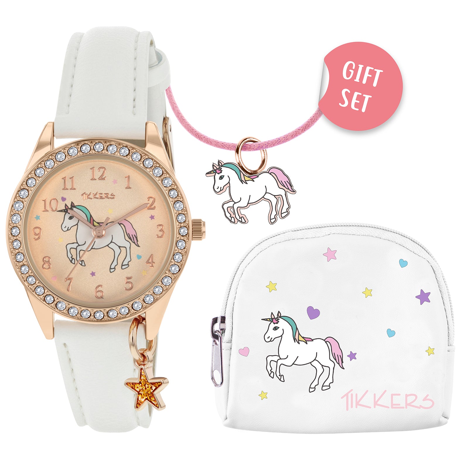 Το ρολόι συνοδεύεται από ένα κολιέ με μενταγιόν μονόκερου και μια όμορφη τσάντα μονόκερου.