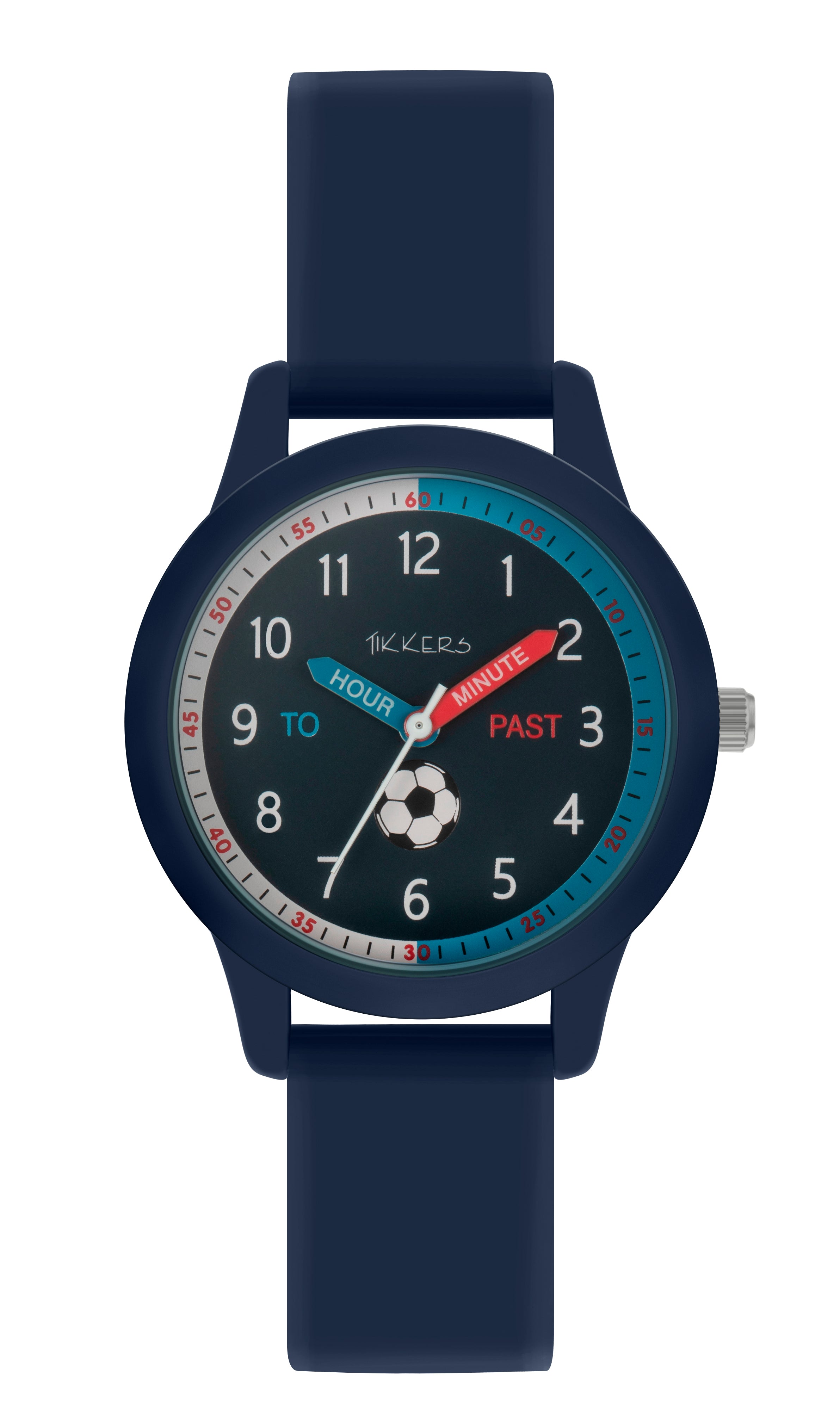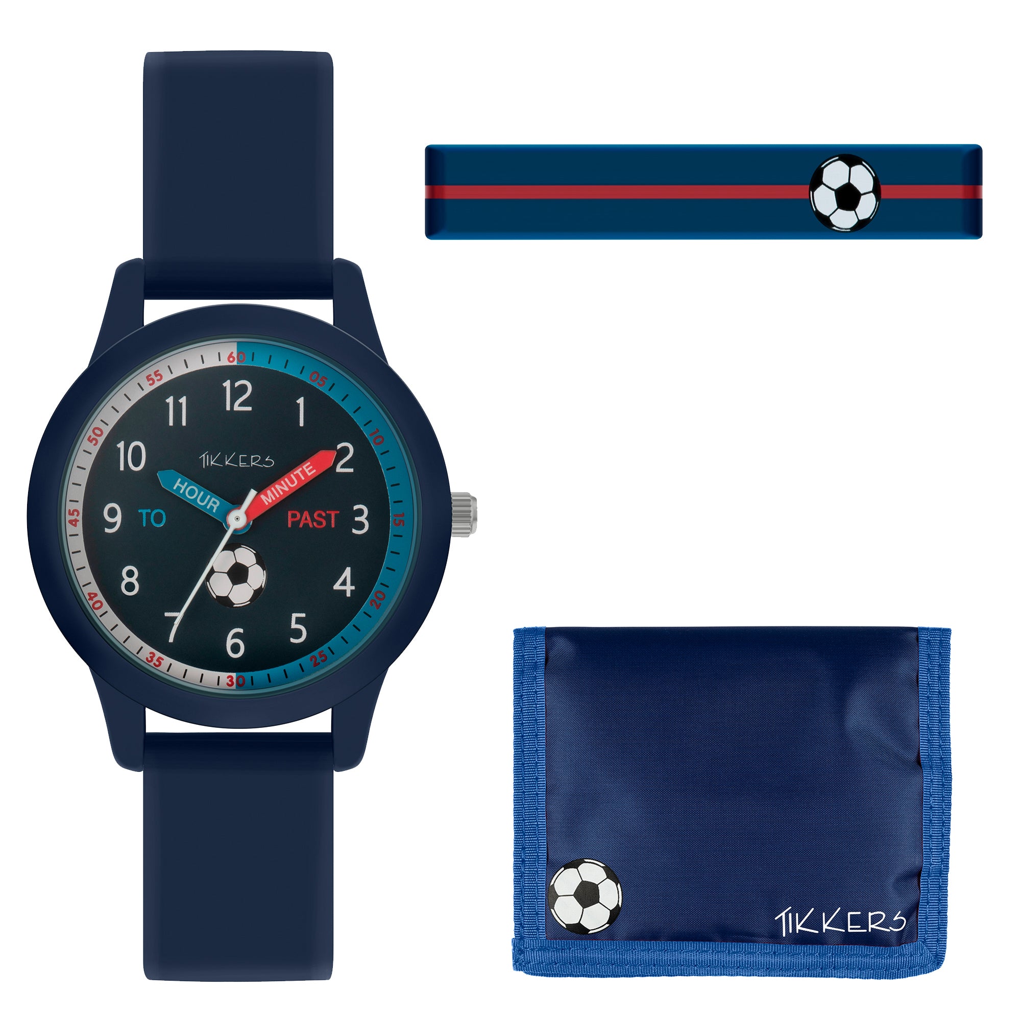 Το σετ δώρου με θέμα το ποδόσφαιρο Tikkers περιέχει ένα μπλε ρολόι με ασορτί λουράκι σιλικόνης. Το καντράν είναι ευανάγνωστο με ενδείξεις ειδικά σχεδιασμένες για να βοηθούν τα παιδιά να λένε την ώρα με σιγουριά.