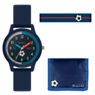 Το ρολόι συνοδεύεται από ριγέ ποδοσφαιρικό βραχιόλι σιλικόνης και μπλε πορτοφόλι.