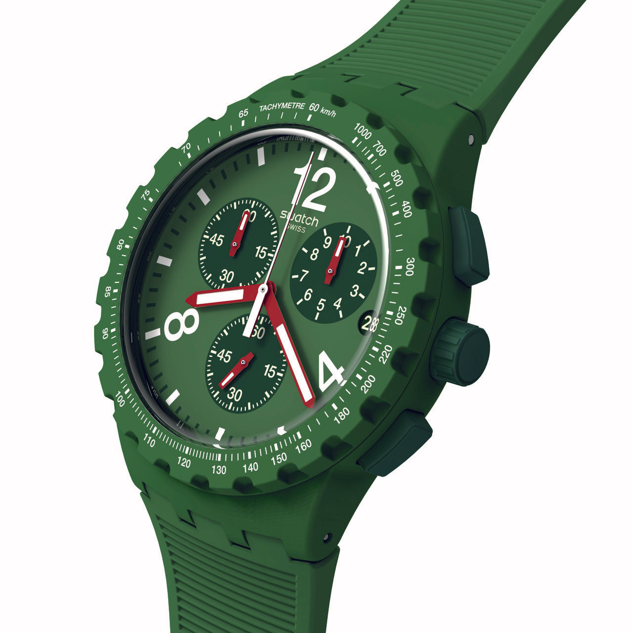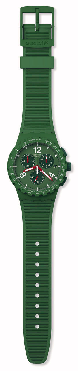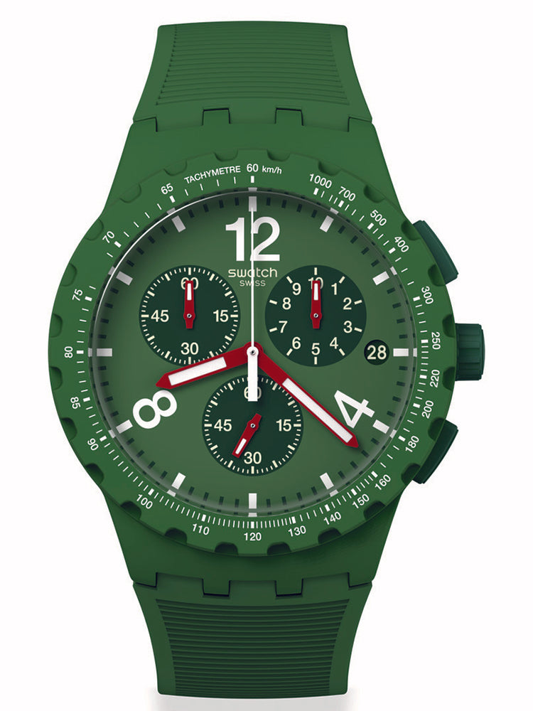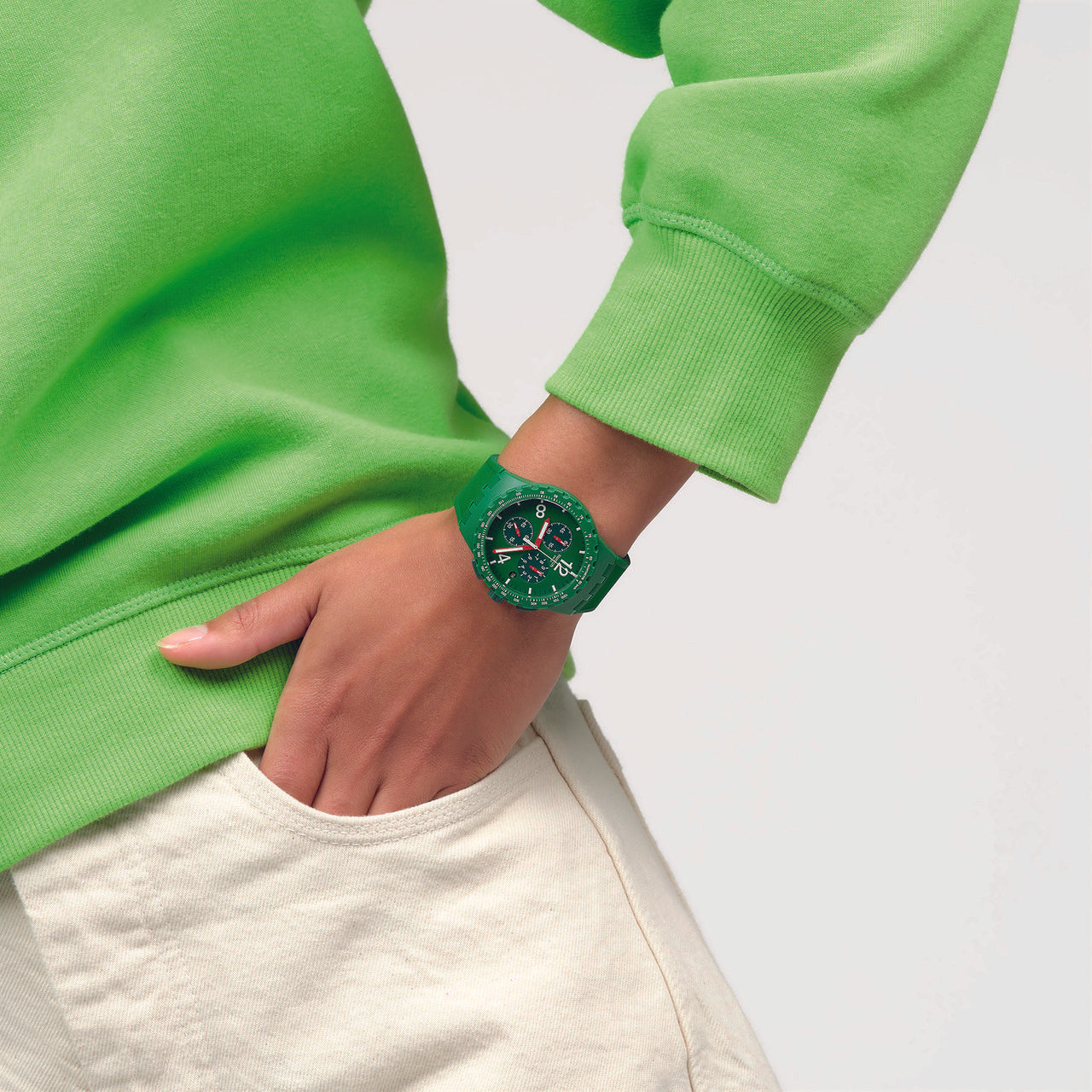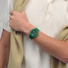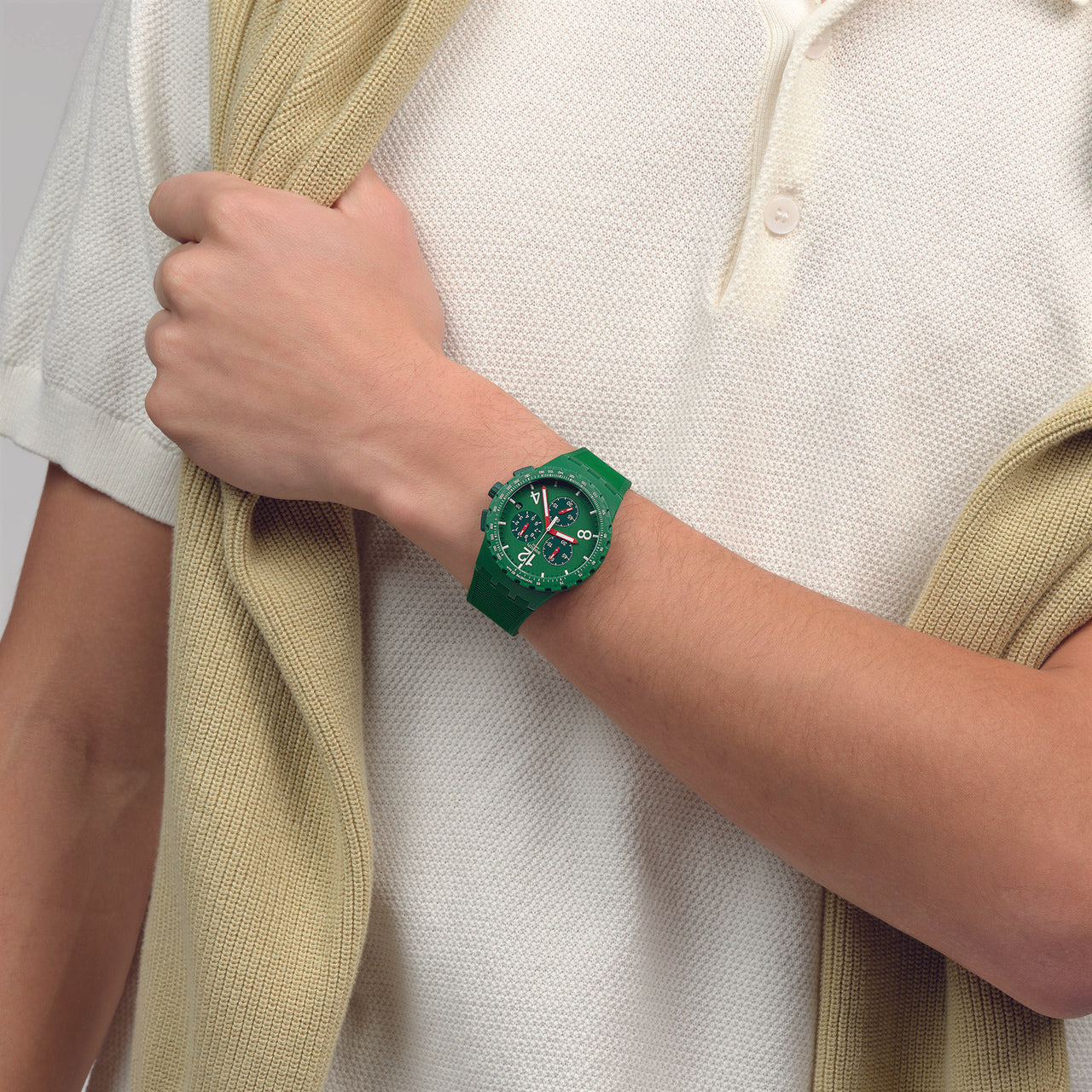 Αυτός ο πράσινος χρονογράφος διαθέτει πράσινο καντράν με μπεζ και σκουροπράσινους εκτυπωμένους δείκτες και ενδείξεις που λάμπουν στο σκοτάδι. Το λουράκι, το θηλάκι και το κούμπωμα σε ενιαίο χρωματικό τόνο ολοκληρώνουν το κυρίαρχο πράσινο look αυτού του σπορτίφ ρολογιού.