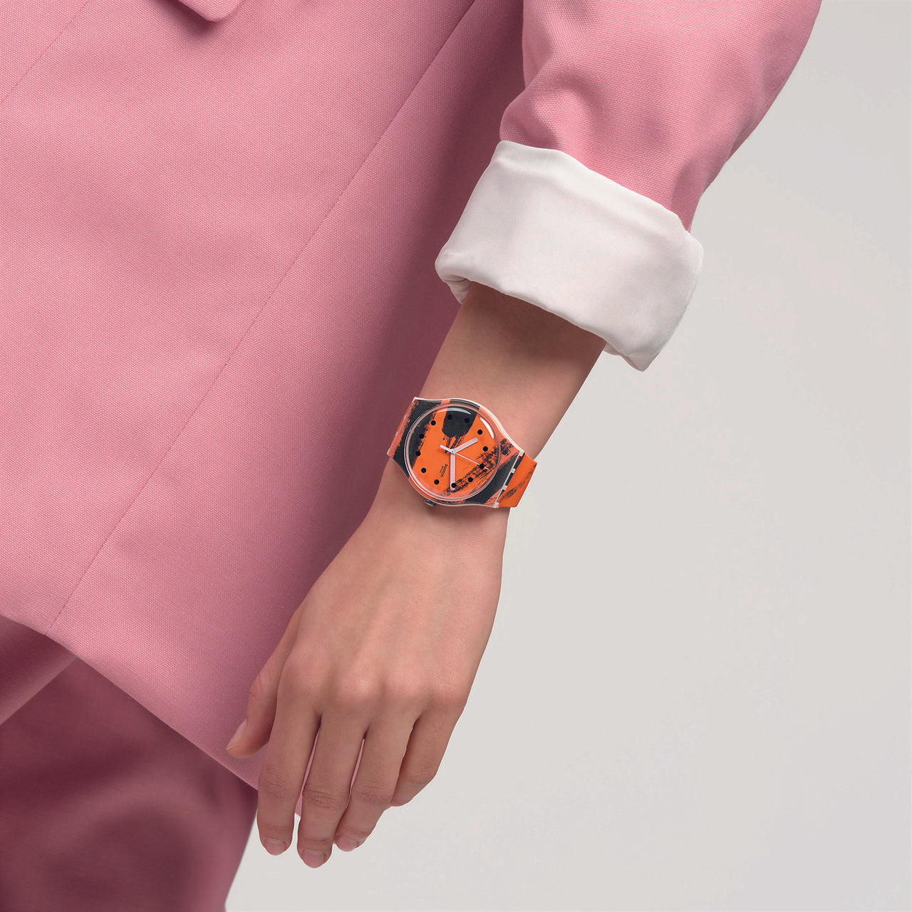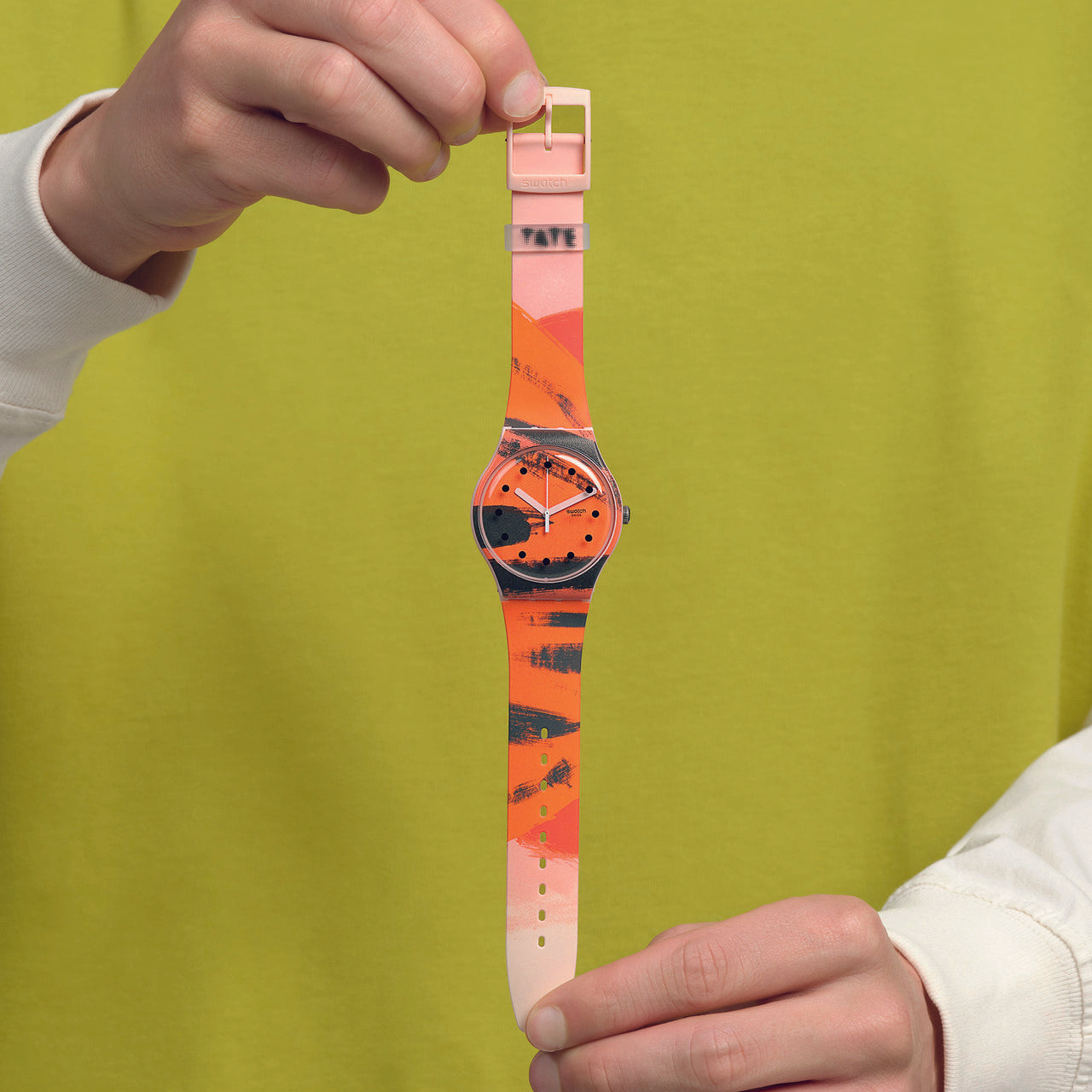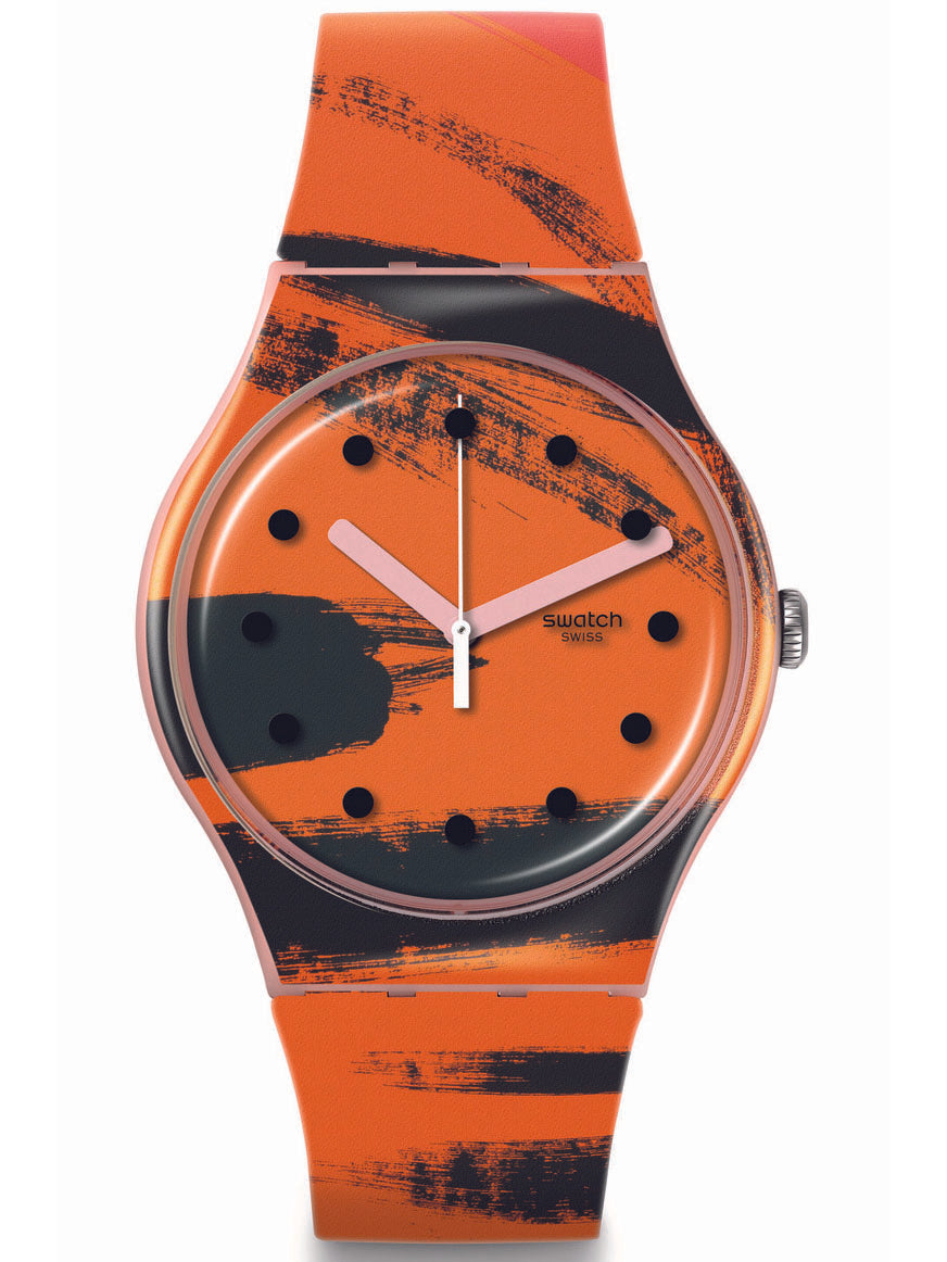 Αυτό το ρολόι της Συλλογής Swatch x Tate Gallery διαθέτει εκτύπωση του έργου της Wilhelmina Barns-Graham Orange and Red on Pink στο καντράν και στην κάσα και το λουράκι σε ανοιχτό ροζ ματ. Στο τζάμι είναι τυπωμένες μαύρες ενδείξεις, ενώ την ώρα δείχνουν ο ροζ ωροδείκτης και λεπτοδείκτης και ο λευκός δείκτης δευτερολέπτων. Το διαφανές ματ θηλάκι φέρει εκτύπωση με το λογότυπο της Tate Gallery.