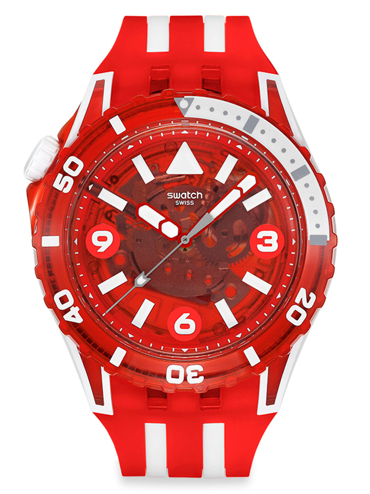 Κάτω από το τζάμι βιολογικής προέλευσης, αυτό το καταδυτικό ρολόι διαθέτει διαφανές κόκκινο καντράν με λευκές τυπωμένες ενδείξεις και αριθμούς, κόκκινο ωροδείκτη και λεπτοδείκτη και γκρι δείκτη δευτερολέπτων, που λάμπουν όλα στο σκοτάδι. Η κάσα συνδυάζει λευκό ματ Bioceramic και γυαλιστερό, διαφανές κόκκινο υλικό βιολογικής προέλευσης και συνοδεύεται από γυαλιστερή, διαφανή κόκκινη στεφάνη βιολογικής προέλευσης με γκρι και λευκή εκτύπωση που λάμπει στο σκοτάδι και λευκή ματ κορώνα Bioceramic στη θέση της ώρας 10. Το ρολόι ολοκληρώνουν το λουράκι σε λευκό ματ και διαφανές κόκκινο ματ, με διαφανές κόκκινο ματ θηλάκι και γυαλιστερό, διαφανές κόκκινο κούμπωμα βιολογικής προέλευσης.