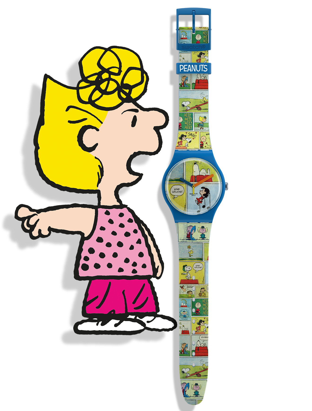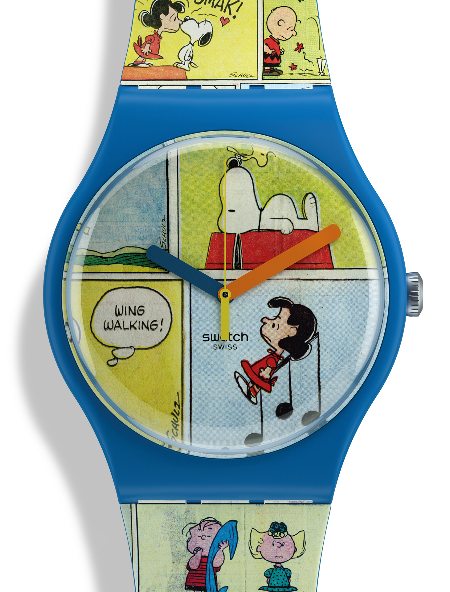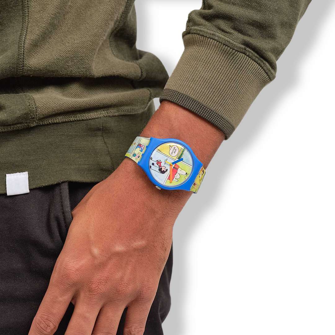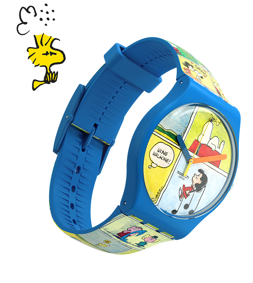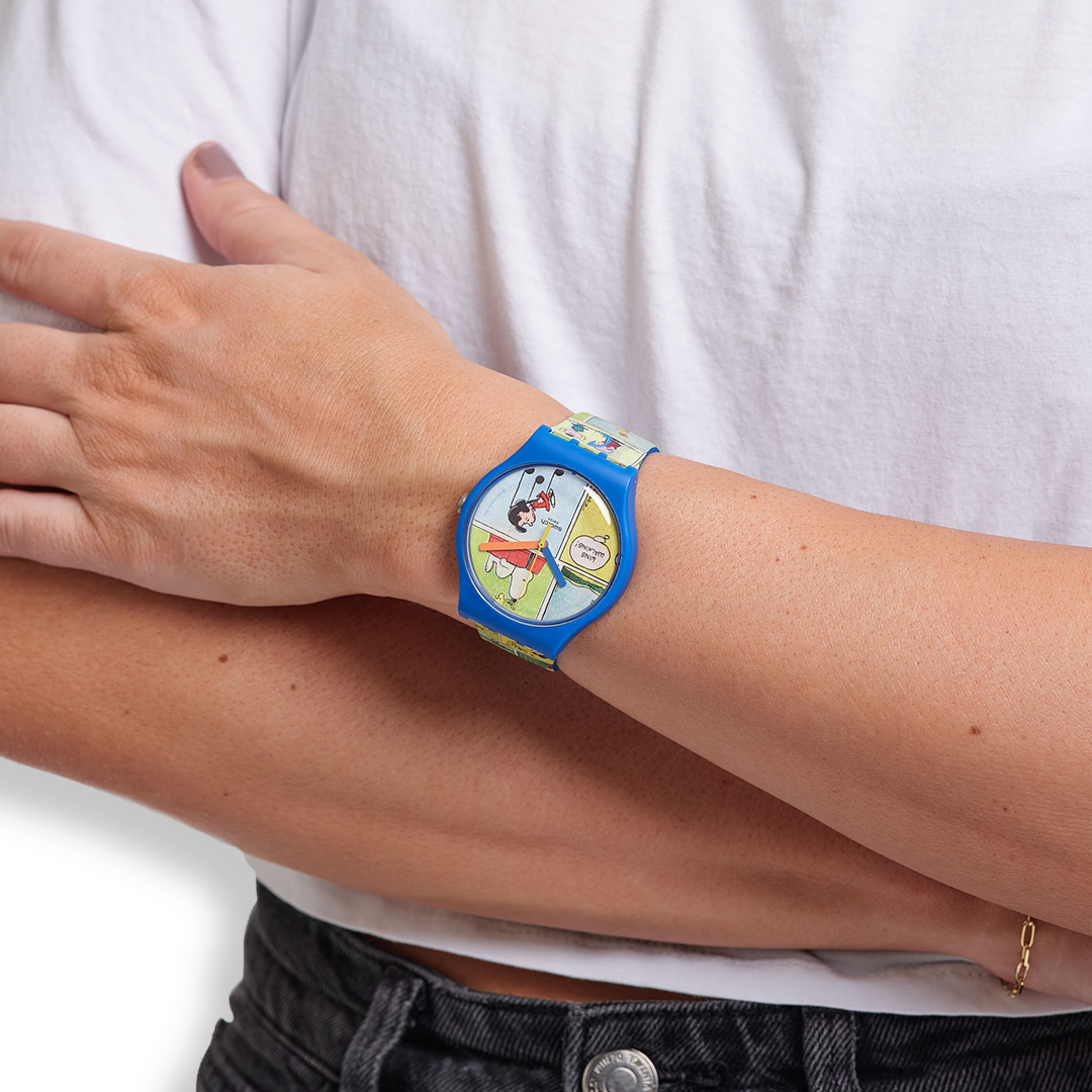 Η αμιγώς μπλε ματ κάσα από υλικό βιολογικής προέλευσης και το λουράκι σιλικόνης είναι το ιδανικό πλαίσιο για το πολύχρωμο, ολόσωμο και περίπλοκο κόμικ σχέδιο σε αυτό το ρολόι Swatch X Peanuts. Η αμιγώς μπλε ματ θηλιά σιλικόνης και η πλαστική αγκράφα χαρίζουν σε αυτό το ρολόι κόμικ Πίνατς μια κλασική και, ταυτόχρονα, διασκεδαστική εμφάνιση.