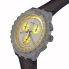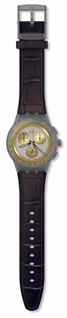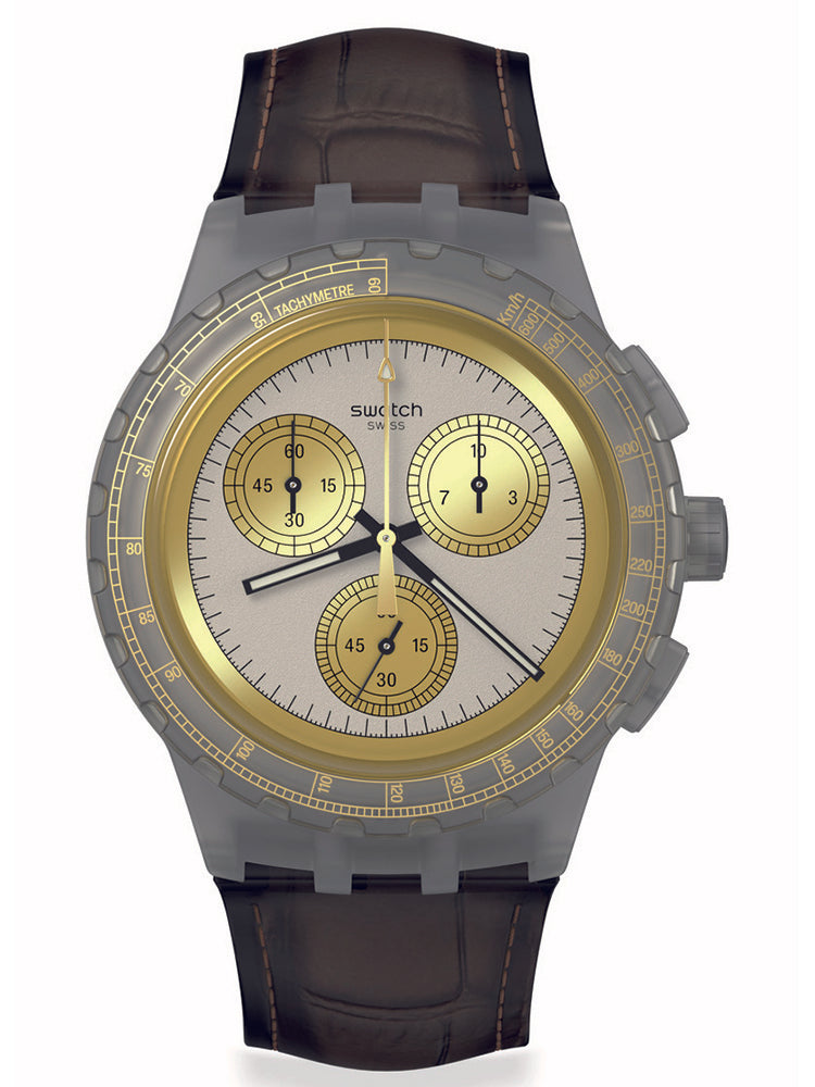 Αυτός ο χρονογράφος σε σκούρο χακί-καφέ διαθέτει γκρι καντράν, μαύρους και χρυσαφί δείκτες που λάμπουν στο σκοτάδι και χρυσαφί χρονόμετρα. Αυτό το ρολόι διαθέτει γκρι στεφάνη με χρυσαφί εκτύπωση σε γκρι ματ κάσα. Το καφέ δερμάτινο λουράκι διαθέτει ημιδιαφανές γκρι ματ κούμπωμα.