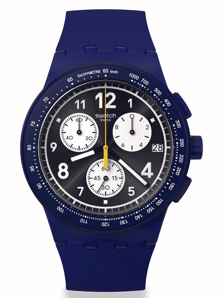 Αυτός ο χρονογράφος σε σκούρο μπλε διαθέτει μαύρο sun-brushed καντράν και κίτρινους και μαύρους ωροδείκτες και λεπτοδείκτες που λάμπουν στο σκοτάδι και ένδειξη ημερομηνίας στο σημείο ώρα 3. Αυτό το ρολόι διαθέτει στεφάνη σε σκούρο μπλε με λευκή εκτύπωση σε κάσα σε σκούρο μπλε και ταιριαστό λουράκι, θηλάκι και κούμπωμα.
