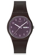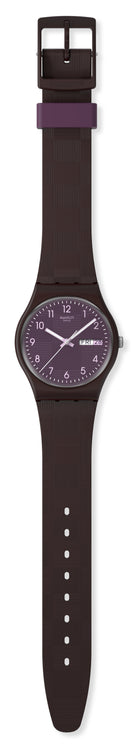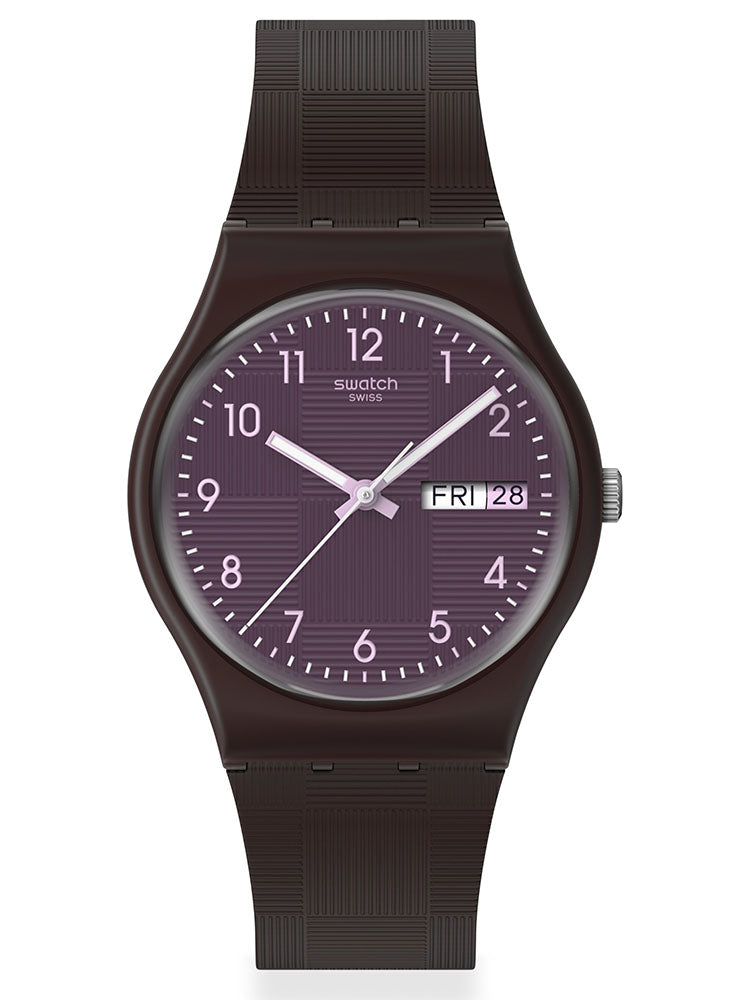 Αυτό το ρολόι έχει ανάγλυφο σκούρο μοβ καντράν με ροζ τυπωμένους αριθμούς, τυπωμένη ζώνη ενδείξεων λεπτών σε άσπρο και ροζ καθώς και παράθυρο ένδειξης ημέρας και ημερομηνίας στη θέση της ώρας 3. Ο ροζ ωροδείκτης και λεπτοδείκτης με εφέ που λάμπει στο σκοτάδι καθώς και ο άσπρος δείκτης δευτερολέπτων δείχνουν την ώρα κάτω από το βιολογικής προέλευσης τζάμι. Η ματ σκούρα καφέ βιολογικής προέλευσης κάσα συμπληρώνεται από το ανάγλυφο, ματ σκούρο καφέ λουράκι, το ματ σκούρο μοβ θηλάκι και το ματ σκούρο καφέ κούμπωμα.