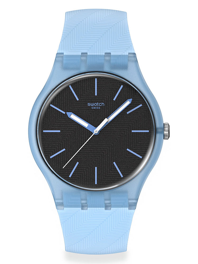 Αυτό το ρολόι έχει ανάγλυφο μαύρο καντράν με τυπωμένους δείκτες ώρας σε ανοιχτό μπλε, ωροδείκτη και λεπτοδείκτη σε ανοιχτό μπλε με εφέ που λάμπει στο σκοτάδι καθώς και άσπρο δείκτη δευτερολέπτων μέσα σε ματ διάφανη ανοιχτή μπλε βιολογικής προέλευσης κάσα με βιολογικής προέλευσης τζάμι. Ένα ανάγλυφο, ματ ανοιχτό μπλε λουράκι με ματ διάφανο ανοιχτό μπλε θηλάκι και κούμπωμα, ολοκληρώνει το ρολόι.