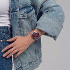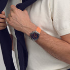Αυτός ο χρονογράφος από ανοξείδωτο ατσάλι διαθέτει μπλε καντράν με πορτοκαλί εκτύπωση, ασημί ωροδείκτη και λεπτοδείκτη που λάμπουν στο σκοτάδι και μπλε δείκτη δευτερολέπτων. Διαθέτει κάσα από βουρτσισμένο ανοξείδωτο ατσάλι και στεφάνη από βουρτσισμένο ανοξείδωτο ατσάλι με μαύρη επίστρωση PVD και τζάμι με εφέ Solar Spectrum. Το ρολόι ολοκληρώνουν το εντυπωσιακό πορτοκαλί λουράκι με τα ταιριαστά θηλάκια και το μισό κούμπωμα από βουρτσισμένο ανοξείδωτο ατσάλι.