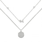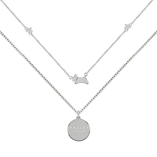 Γυναικείο  κολιέ της εταιρείας Radley London απο ατσάλι, με διπλό κρεμαστό, ένα με φιγούρα σκύλου και αστέρια στην αλυσίδα και το άλλο σε στρογγυλό σχήμα με το λογότυπο της εταιρείας.