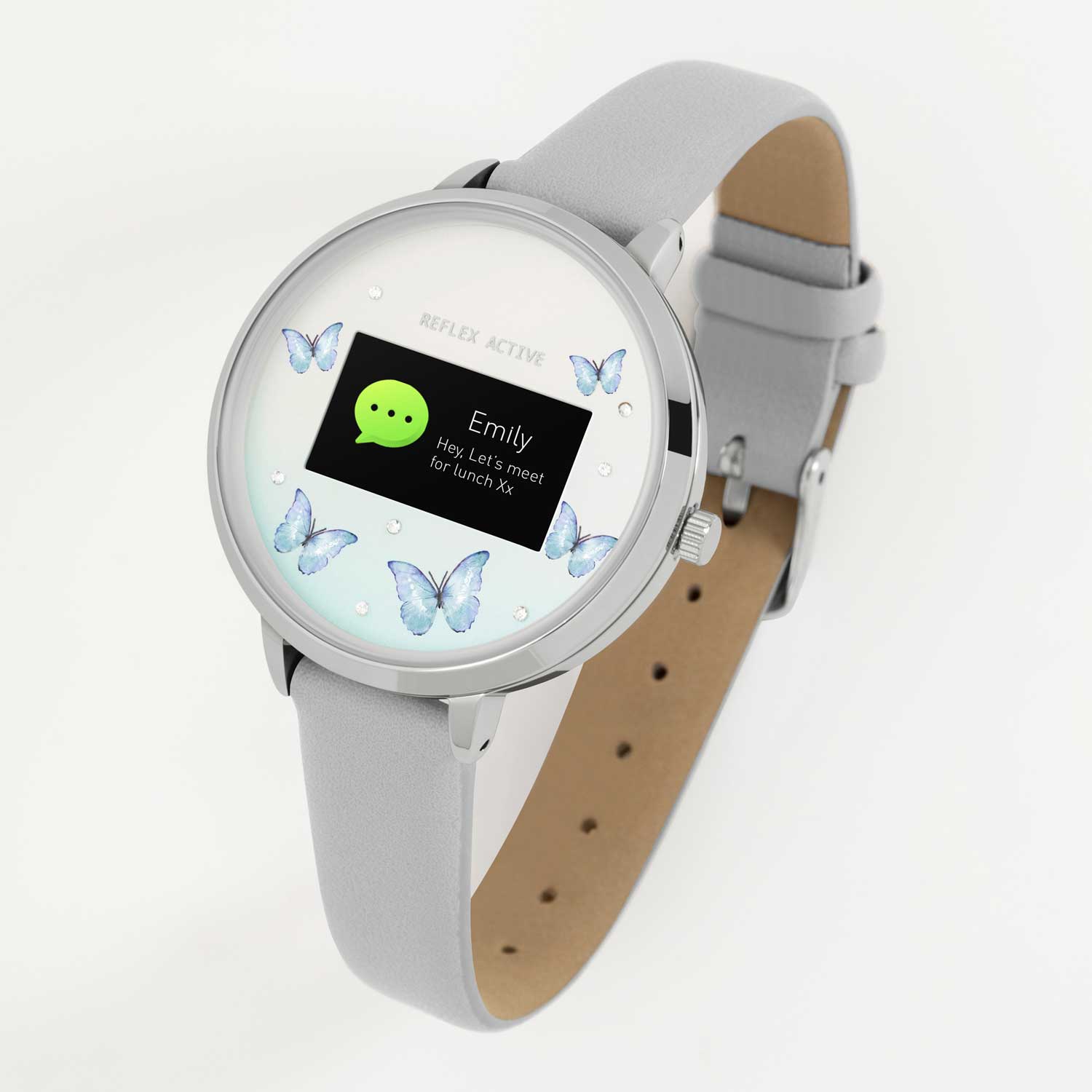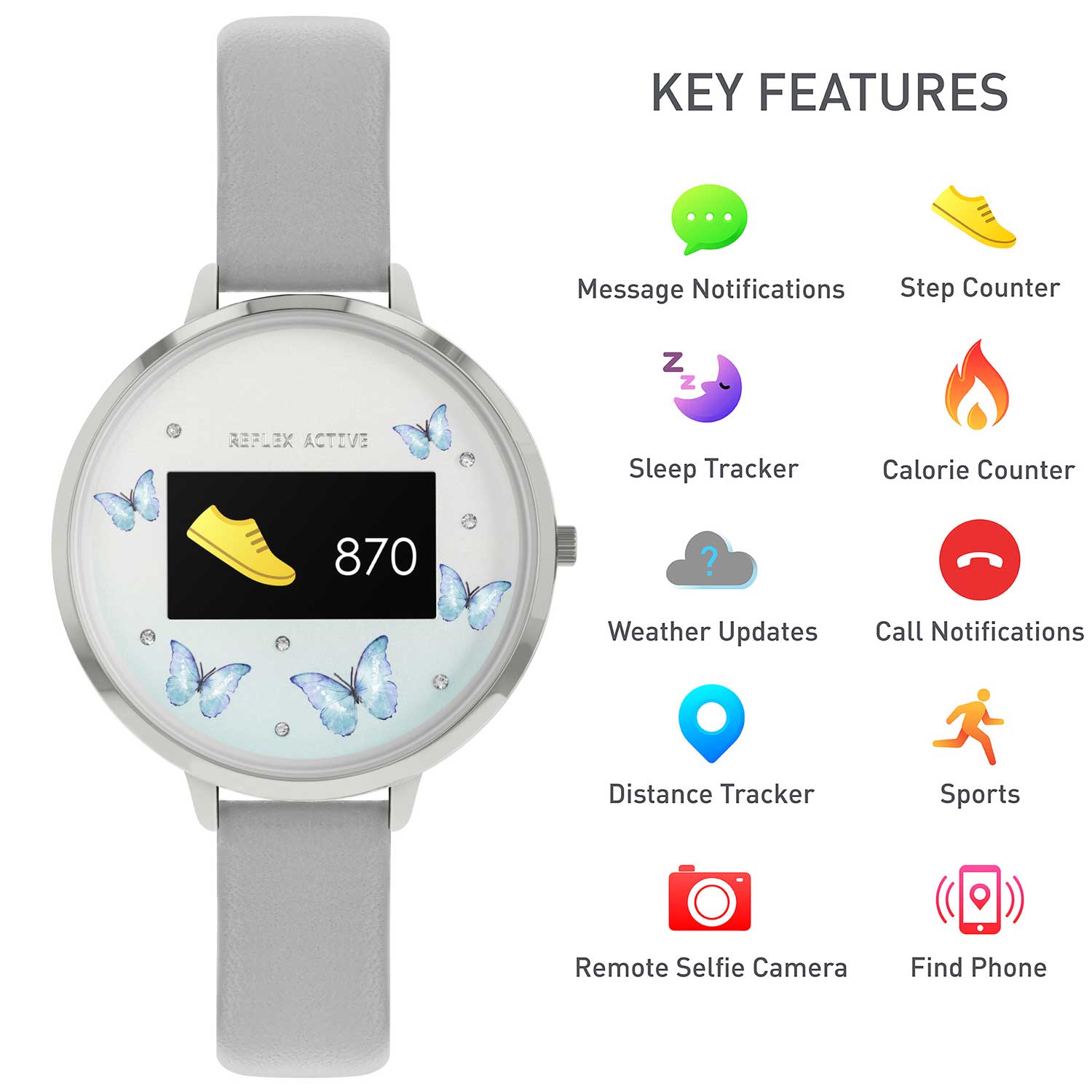 Reflex Active - Το πιο έξυπνο ρολόι! Παρουσιάζουμε το έξυπνο ρολόι Reflex Active Series 3 με έγχρωμη οθόνη αφής, παρακολούθηση δραστηριοτήτων και διάρκεια μπαταρίας έως και 7 ημέρες. Οι δυνατότητες του περιλαμβάνουν: λήψη κλήσεων και ειδοποιήσεων, ανάγνωση μηνυμάτων και email, παρακολούθηση συγκεκριμένων δραστηριοτήτων (τρέξιμο/περπάτημα/ποδηλασία/αναρρίχηση) σε πραγματικό χρόνο, μέτρηση απόστασης/βημάτων/θερμίδων, ζωντανές ενημερώσεις καιρού, έλεγχος κάμερας selfie, λειτουργία εύρεσης τηλεφώνου, παρακολούθηση ύπνου, ξυπνητήρι και υπενθυμίσεις. Με στρογγυλό καντράν ασημί χρώματος με ζιργκόν και σχέδιο με πεταλούδες και γκρι λουράκι με. Κάθε ρολόι πωλείται σε συσκευασία δώρου και περιλαμβάνει εγχειρίδιο οδηγιών, φορτιστή USB (σφραγισμένη επαναφορτιζόμενη μπαταρία) και 2 χρόνια εγγύηση κατασκευαστή. Ανθεκτικό στις γρατσουνιές και αδιάβροχο σε τυχαία επαφή με το νερό. Κατεβάστε τη δωρεάν εφαρμογή Reflex Active τώρα για να εξερευνήσετε περισσότερες λεπτομέρειες. Συμβατό με IOS και Android.