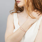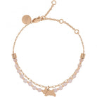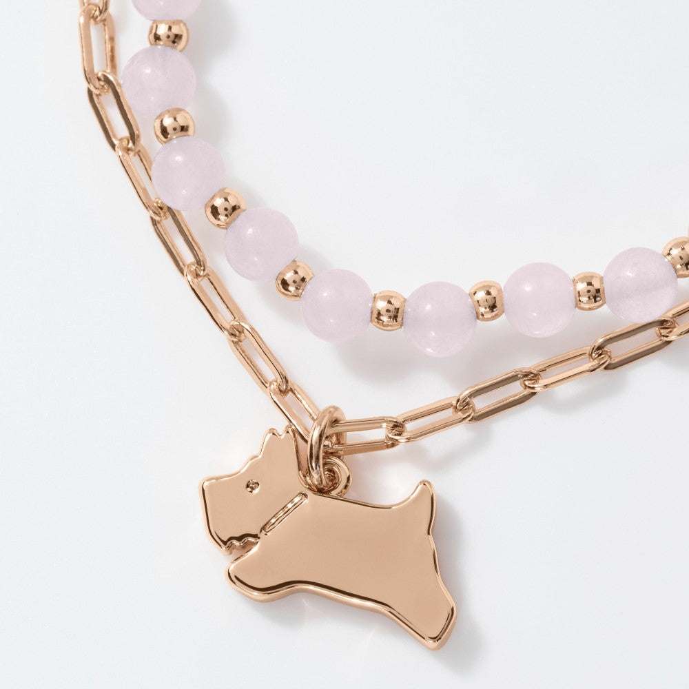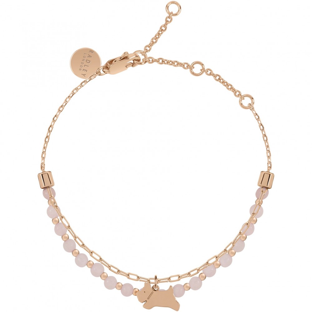 Γυναικείο βραχιόλι της εταιρείας Radley London απο ατσάλι σε ροζ χρυσό χρώμα με διπλή αλυσίδα, μια διακοσμημένη με χάντρες ροζ χρώματος και η άλλη με φιγούρα σκύλου.