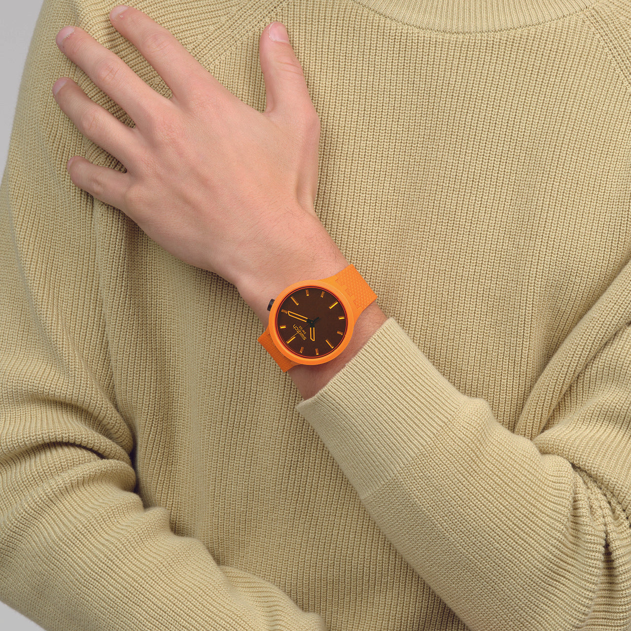 Αυτό το μεγάλο πορτοκαλί ρολόι από υλικά βιολογικής προέλευσης ξεχωρίζει χάρη στην ειδική τεχνική χάραξης που προσδίδει στο καφέ καντράν του την χαρακτηριστική του λάμψη. Η πορτοκαλί ματ κάσα, το λουράκι και τα θηλάκια ολοκληρώνουν το εντυπωσιακό look.