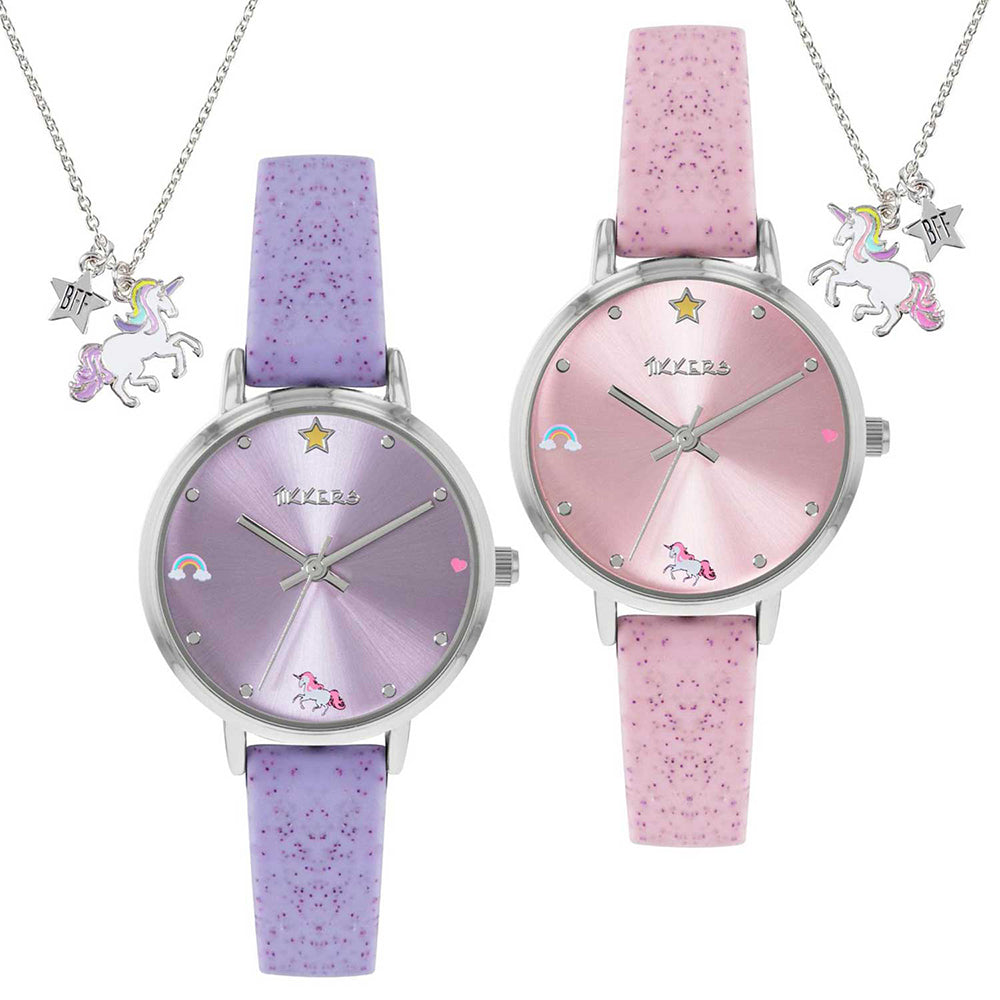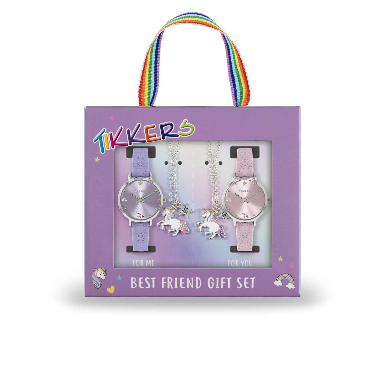 Το τέλειο σετ ρολογιών για να χαρίσετε σε δύο καλύτερες φίλες! Ένα σετ Tikkers με δύο ρολόγια και κολιέ, ένα για εσάς και ένα για την καλύτερή σας φίλη! Όμορφα ροζ και μωβ σχέδια με καντράν μονόκερου, ουράνιου τόξου και αστεριού. Τα αστραφτερά λουράκια και τα ασορτί κολιέ μονόκερου ολοκληρώνουν αυτό το όμορφο σετ. Συσκευασμένα σε συσκευασία δώρου Tikkers. Εγγύηση 1 έτους.