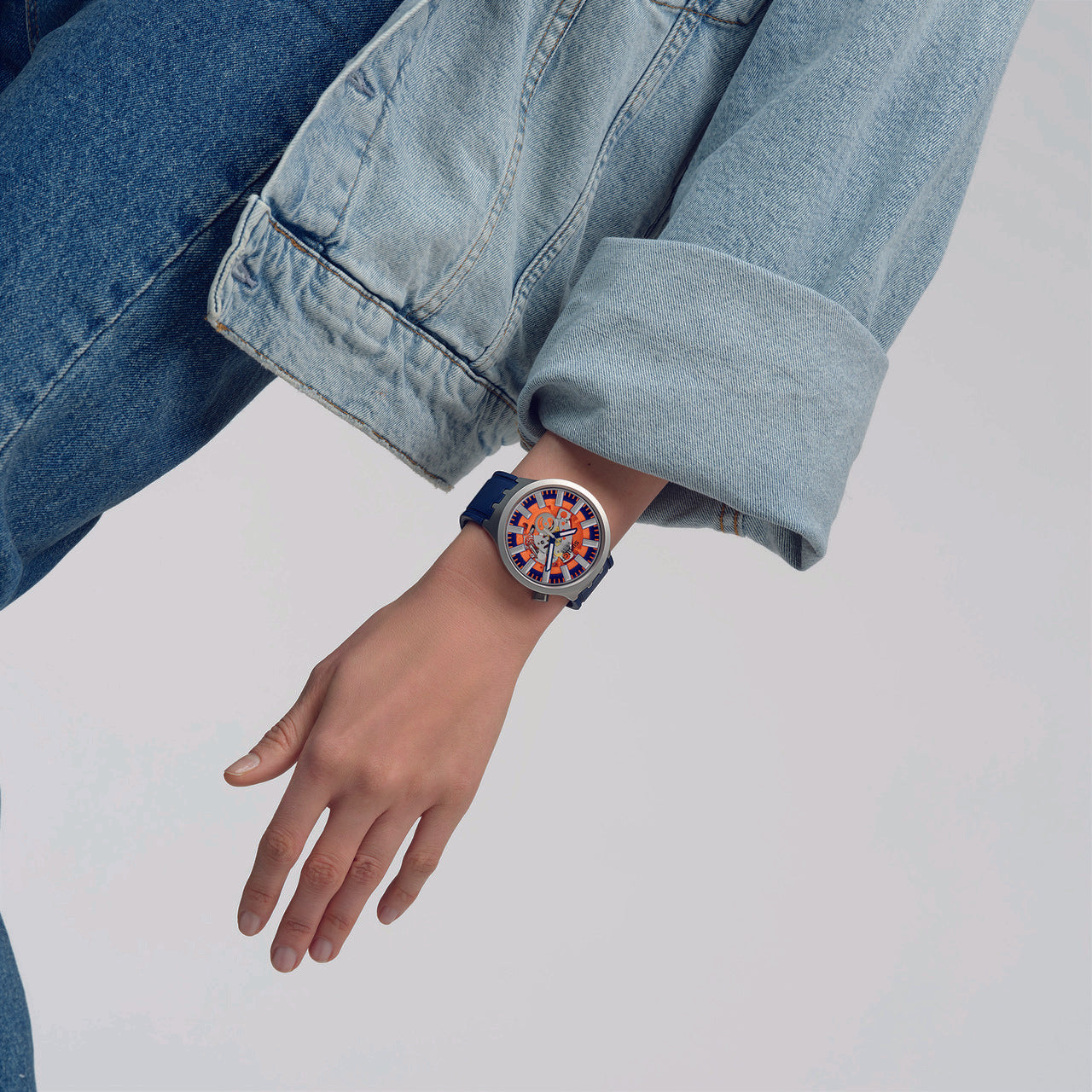 Αυτό το μεγάλου μεγέθους ρολόι διαθέτει σκούρο μπλε ανοιχτό καντράν με πορτοκαλί και ασημί εκτύπωση και κάσα και στεφάνη από αμμοβολισμένο ανοξείδωτο ατσάλι. Την ώρα δείχνουν ο ωροδείκτης και λεπτοδείκτης σε σκούρο μπλε που λάμπουν στο σκοτάδι και ο λευκός δείκτης δευτερολέπτων. Το ρολόι ολοκληρώνεται με το σκούρο μπλε λουράκι με τα πορτοκαλί και σκούρα μπλε θηλάκια και το μισό κούμπωμα από ανοξείδωτο ατσάλι.