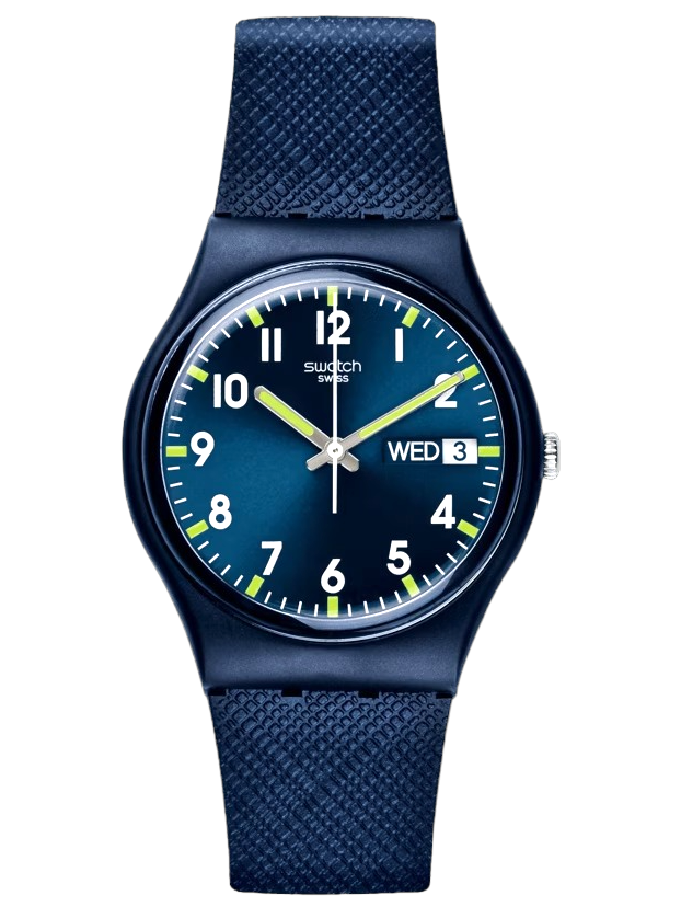 Το sun-brushed μπλε καντράν αυτού του ρολογιού διαθέτει πράσινες ενδείξεις που λάμπουν στο σκοτάδι, αραβικά αριθμητικά και ένδειξη ημέρας/ημερομηνίας για εύκολη καταγραφή του χρόνου. Το λουράκι σε βαθύ μπλε με μοτίβο προσθέτει μια δόση ανάγλυφης υφής.