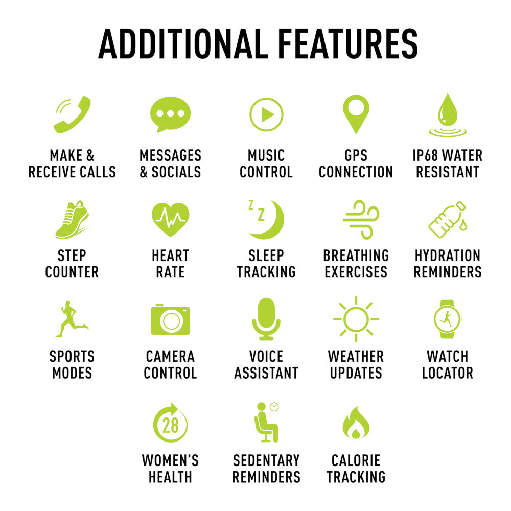 Amoled Οθόνη,Bluetooth 5.0,WhatsApp,Απάντηση κλήσεων,Ασκήσεις αναπνοής,Διπλή Ένδειξη Ώρας (Χρήση στο Εξωτερικό),Δυνατότητα Μόνιμα Ενεργής Οθόνης,Ειδοποιήσεις social media,Ειδοποιήσεις για τον καιρό,Ειδοποίηση κλήσεων,Έλεγχος μουσικής,Ενημέρωση ενυδάτωσης,Έξυπνες ειδοποιήσεις και εμφάνιση μηνυμάτων SMS,καταγραφή αθλητικής δραστηριότητας,Λειτουργία εύρεσης ρολογιού,Λειτουργία εύρεσης τηλεφώνου,Μέτρηση απόστασης, Μέτρηση θερμίδων,Μετρητής βημάτων, Παρακολούθηση ύπνου,Προσφέρει λειτουργία υπενθύμισης έμμηνου κύκλου για τις κυρίες, Σύνδεση GPS, Χειρισμός κάμερας από απόσταση