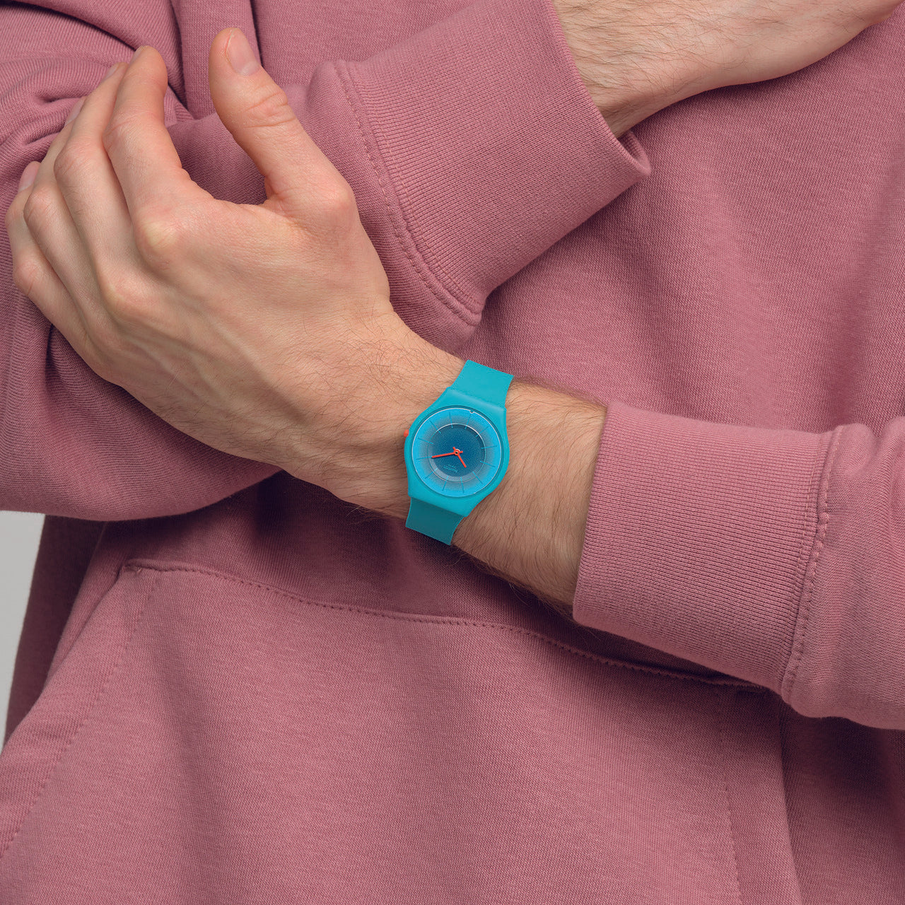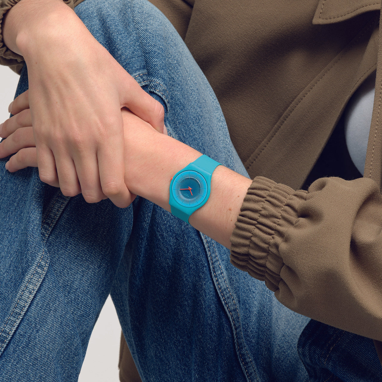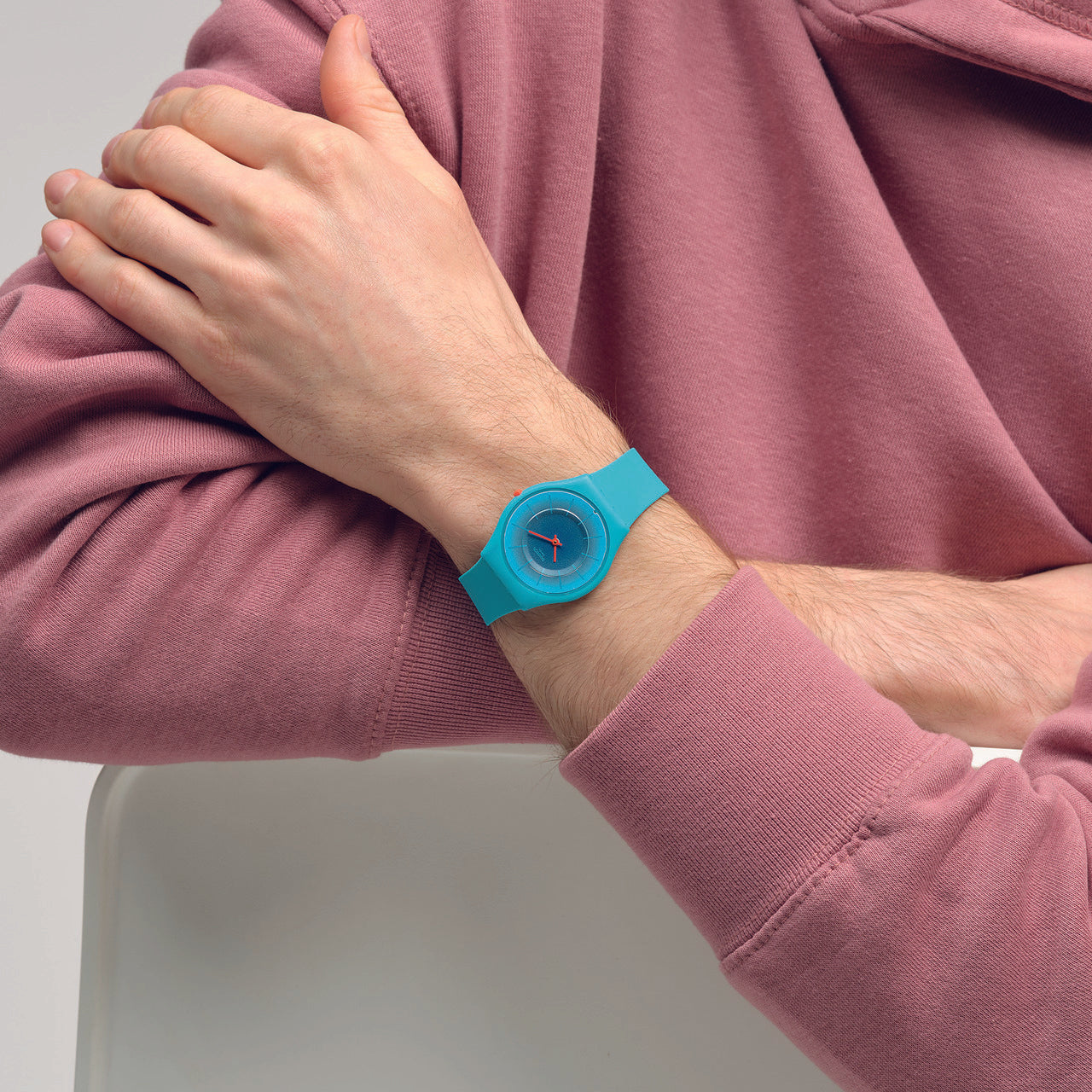 Αυτό το εξαιρετικά λεπτό ρολόι ακτινοβολεί μπλε, από το ντεγκραντέ εκτυπωμένο καντράν του με τις μπλε ενδείξεις σε κάσα και τζάμι βιολογικής προέλευσης μέχρι το λουράκι του με το ταιριαστό θηλάκι και κούμπωμα. Οι πορτοκαλί δείκτες και η κορώνα προσθέτουν ένα διασκεδαστικό στοιχείο αντίθεσης σε αυτό το μπλε ρολόι.