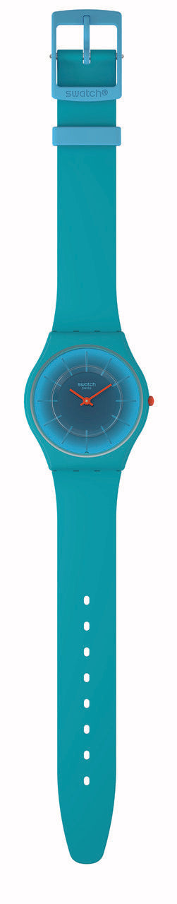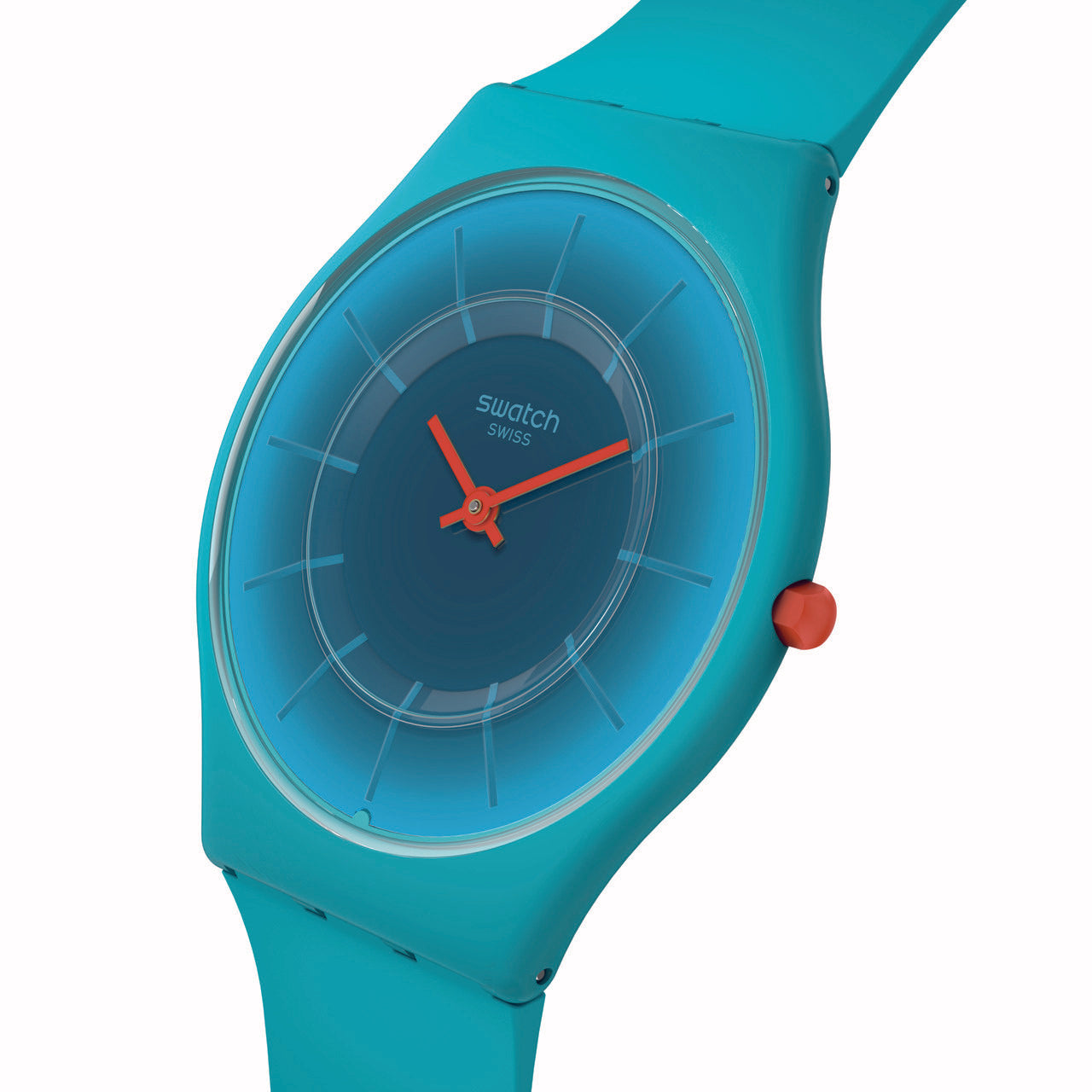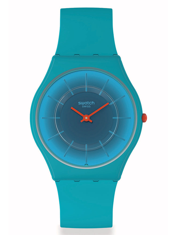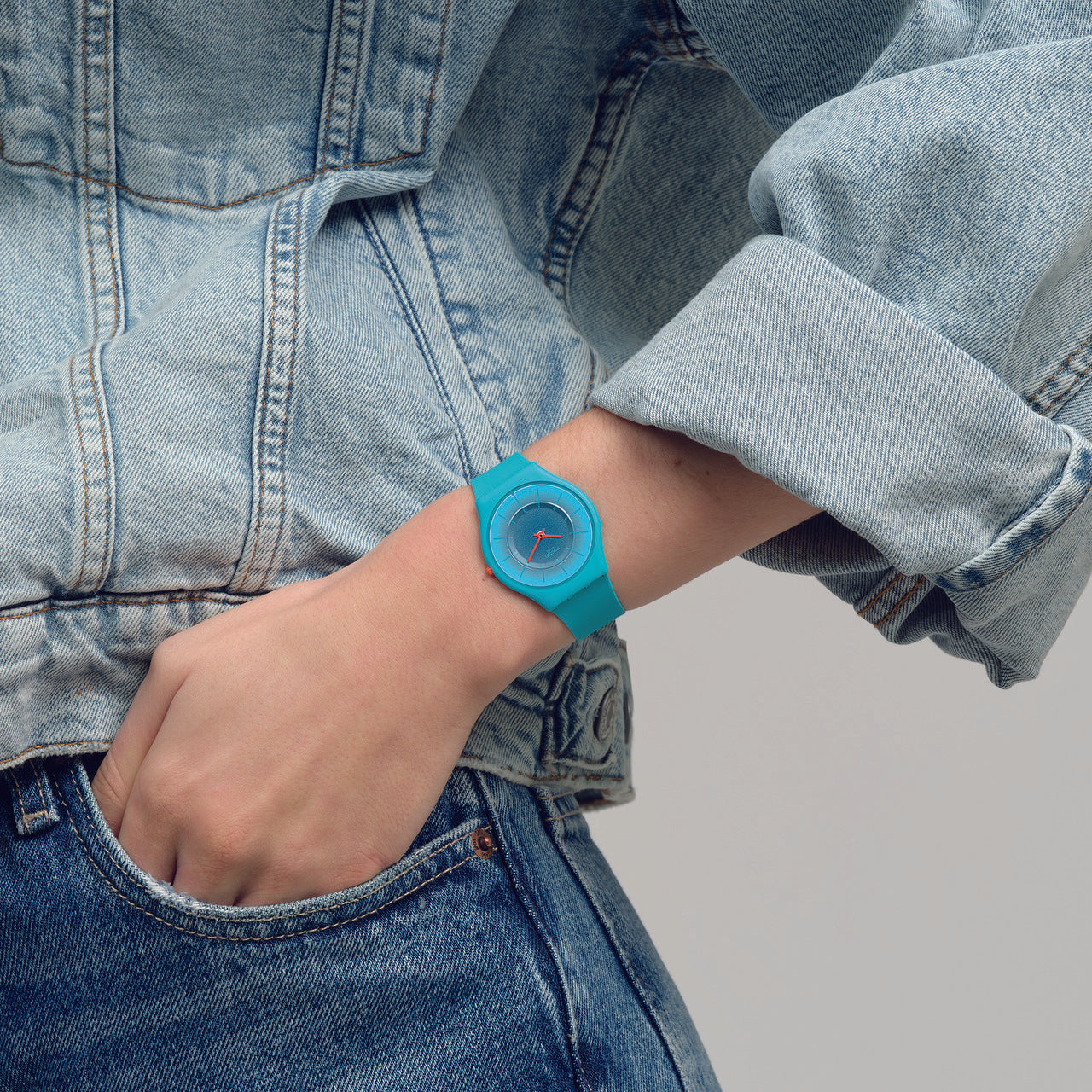 Αυτό το εξαιρετικά λεπτό ρολόι ακτινοβολεί μπλε, από το ντεγκραντέ εκτυπωμένο καντράν του με τις μπλε ενδείξεις σε κάσα και τζάμι βιολογικής προέλευσης μέχρι το λουράκι του με το ταιριαστό θηλάκι και κούμπωμα. Οι πορτοκαλί δείκτες και η κορώνα προσθέτουν ένα διασκεδαστικό στοιχείο αντίθεσης σε αυτό το μπλε ρολόι.