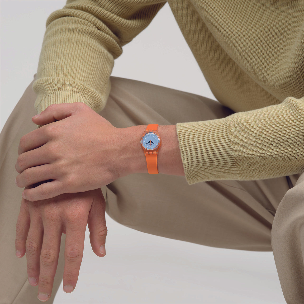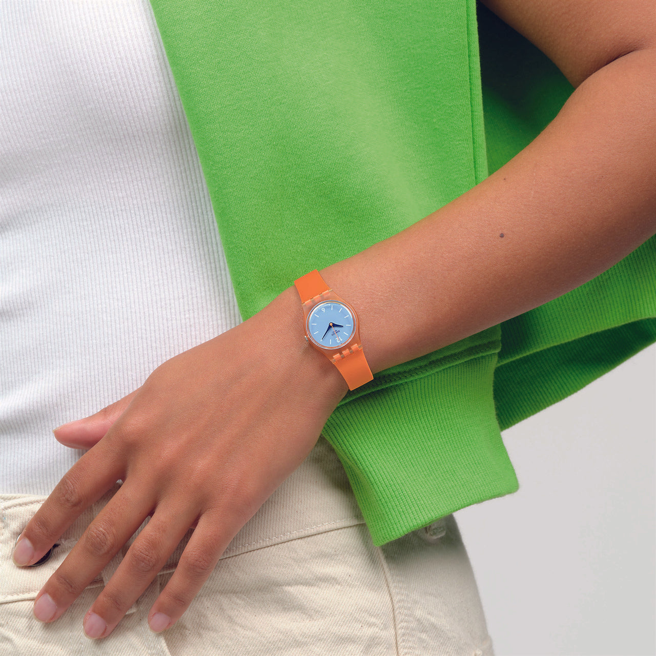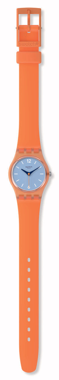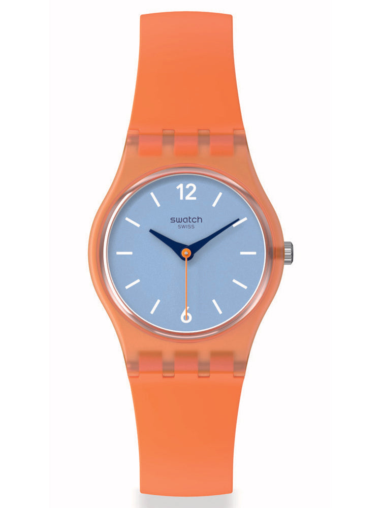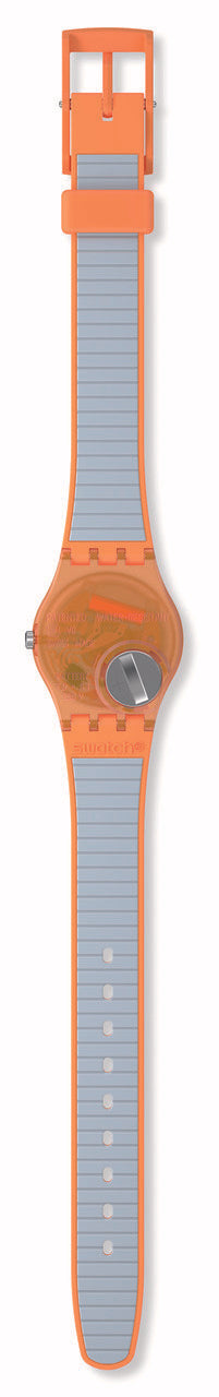 Αυτό το παιχνιδιάρικο ρολόι διαθέτει γαλάζιο καντράν με λευκούς εκτυπωμένους αριθμούς και ενδείξεις και ωροδείκτες και λεπτοδείκτες σε σκούρο μπλε, σε διαφανή πορτοκαλί κάσα. Διαθέτει λουράκι που είναι πορτοκαλί στην μπροστινή πλευρά και γαλάζιο με ανάγλυφη υφή στην πίσω πλευρά.