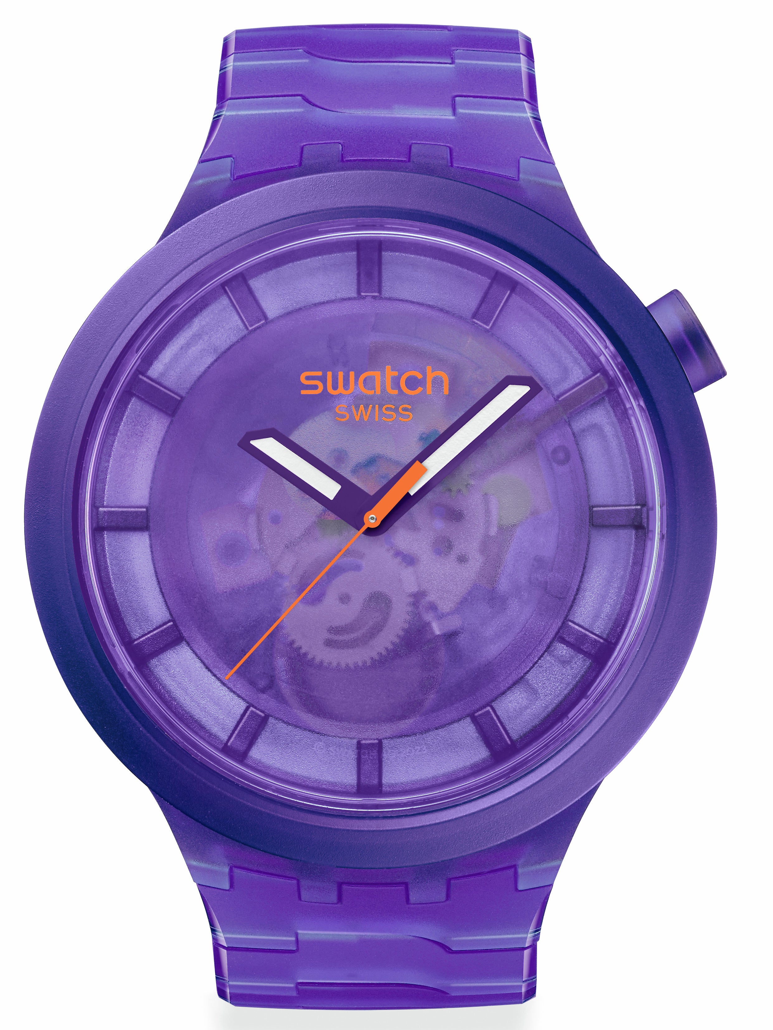 Αυτό το μεγάλου μεγέθους μοβ ρολόι διαθέτει εξ’ ολοκλήρου διαφανές look, από την κάσα, το καντράν και τη στεφάνη βιολογικής προέλευσης μέχρι το μπρασελέ βιολογικής προέλευσης με το κούμπωμα τύπου πεταλούδα. Το διαφανές μοβ καντράν βιολογικής προέλευσης επιτρέπει να φαίνεται ο μηχανισμός, ενώ ο μοβ ωροδείκτης και λεπτοδείκτης που λάμπουν στο σκοτάδι και ο αντιθετικός πορτοκαλί δείκτης δευτερολέπτων δείχνουν την ώρα κάτω από το τζάμι βιολογικής προέλευσης.