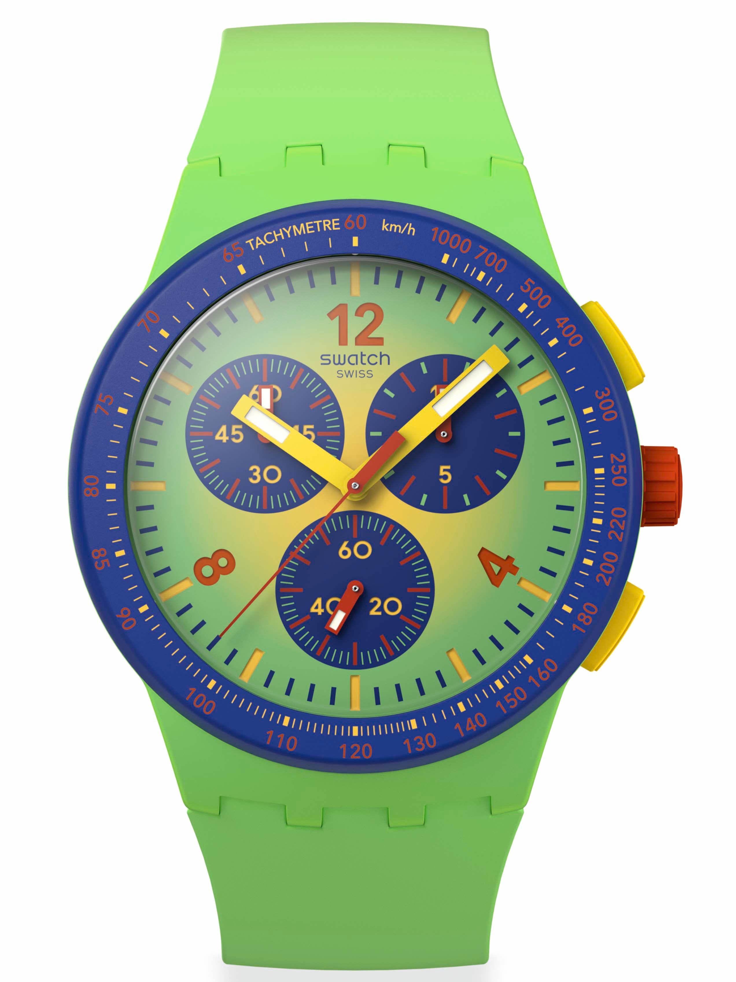 Αυτός ο χρονογράφος διαθέτει καντράν σε ντεγκραντέ κίτρινο και ανοιχτό πράσινο χρώμα με πολύχρωμη εκτύπωση, κίτρινο ωροδείκτη και λεπτοδείκτη που λάμπουν στο σκοτάδι και κόκκινο δείκτη δευτερολέπτων. Η κάσα σε ανοιχτό πράσινο ματ χρώμα διαθέτει μπλε ματ στεφάνη με κόκκινη και κίτρινη τυπωμένη ταχυμετρική κλίμακα, κίτρινα ματ κουμπιά πίεσης και κόκκινη κορώνα. Το ρολόι ολοκληρώνεται με το λουράκι σε ντεγκραντέ ανοιχτό πράσινο και κίτρινο χρώμα, το μπλε ματ θηλάκι και το μπλε ματ κούμπωμα.