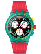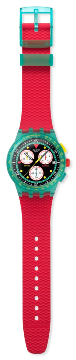 Αυτός ο ρετρό χρονογράφος είναι εμπνευσμένος από ένα Swatch GENT της δεκαετίας του ‘80: το συλλεκτικό EMERALD DIVER (GG703). Το πολύχρωμο καντράν έχει μαύρο ωροδείκτη και λεπτοδείκτη με εφέ που λάμπει στο σκοτάδι, έναν κίτρινο δείκτη δευτερολέπτων χρονογράφου καθώς και ένα παράθυρο ένδειξης ημερομηνίας στη θέση της ώρας 3. Η ματ διαφανής πράσινη κάσα συμπληρώνεται από αντίστοιχη στεφάνη με κίτρινη τυπωμένη ταχυμετρική κλίμακα. Ένα ανάγλυφο ματ κόκκινο λουράκι με ματ διαφανές πράσινο θηλάκι και κούμπωμα, ολοκληρώνουν το ρολόι.