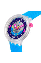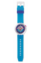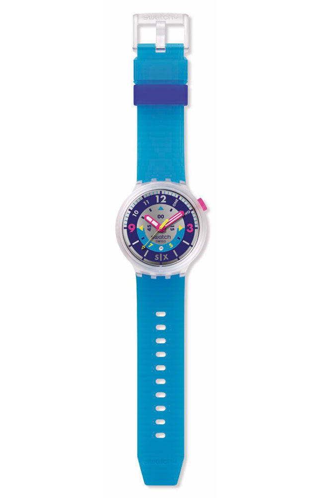 Αυτό το ρετρό υπερμέγεθες ρολόι είναι εμπνευσμένο από ένα Swatch LADY της δεκαετίας του ‘90: το συλλεκτικό HIELO (LK146). Ξεχωρίζει για το καντράν με τους πολύχρωμους τυπωμένους αριθμούς, τα γραμμένα νούμερα, τους δείκτες ώρας, το εφέ καθρέφτη και το παράθυρο ένδειξης ημερομηνίας στη θέση 6. Ο ροζ ωροδείκτης και λεπτοδείκτης με εφέ που λάμπει στο σκοτάδι και ο κίτρινος δείκτης δευτερολέπτων δείχνουν την ώρα. Η ματ διάφανη κάσα με αντίστοιχη στεφάνη συμπληρώνονται από ένα ανάγλυφο, ματ διαφανές μπλε λουράκι με ματ διαφανές σκούρο μπλε θηλάκι, ματ διαφανές μπλε θηλάκι και ματ διαφανές μισό κούμπωμα.