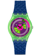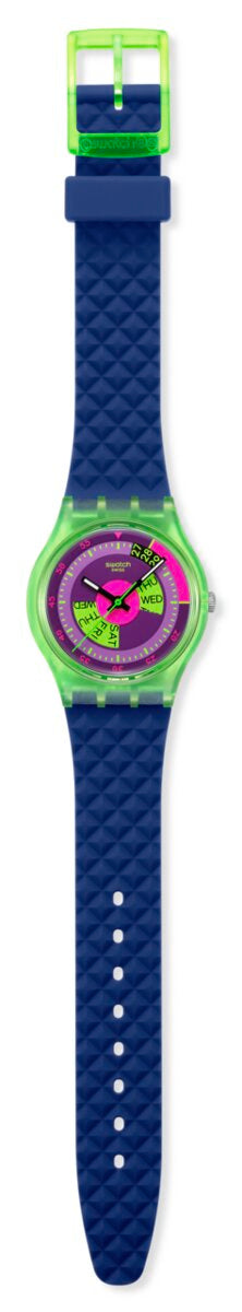 Αυτό το ρετρό ρολόι είναι εμπνευσμένο από ένα Swatch GENT της δεκαετίας του ‘90: το συλλεκτικό SKYCHART (GN705). Το πολύχρωμο καντράν του διαθέτει ειδικά παράθυρα ένδειξης ημέρας στη θέση των ωρών 3 και 9 καθώς και παράθυρο ένδειξης ημερομηνίας στη θέση της ώρας 1. Ο μαύρος ωροδείκτης και λεπτοδείκτης με εφέ που λάμπει στο σκοτάδι και ο πράσινος δείκτης δευτερολέπτων δείχνουν την ώρα κάτω από το βιολογικής προέλευσης τζάμι. Η ματ διαφανής πράσινη βιολογικής προέλευσης κάσα συμπληρώνεται από ένα ανάγλυφο, ματ σκούρο μπλε λουράκι με ματ σκούρο μπλε θηλάκι και ματ διαφανές πράσινο κούμπωμα.